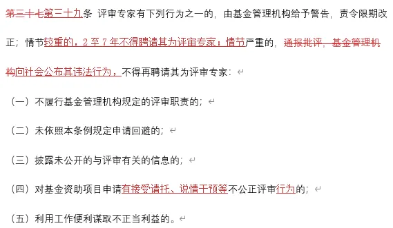 原先第三十七条在修订中加上了情节较重的评审专家会遭受的处罚“情节较重的,2至7年不得聘请其为评审专家”,将情节严重的处罚“通报批评”改为“向社会公布七违法行为”,并且完善了违规行为表单的第四种行为:“对基金资助项目申请有接受请托、说情干预等不公正评审行为的”。原先第三十八条在修订中加上完善了违规行为表单,增加了一种违规行为:“(五)有其他滥用职权、玩忽职守、徇私舞弊行为的”。