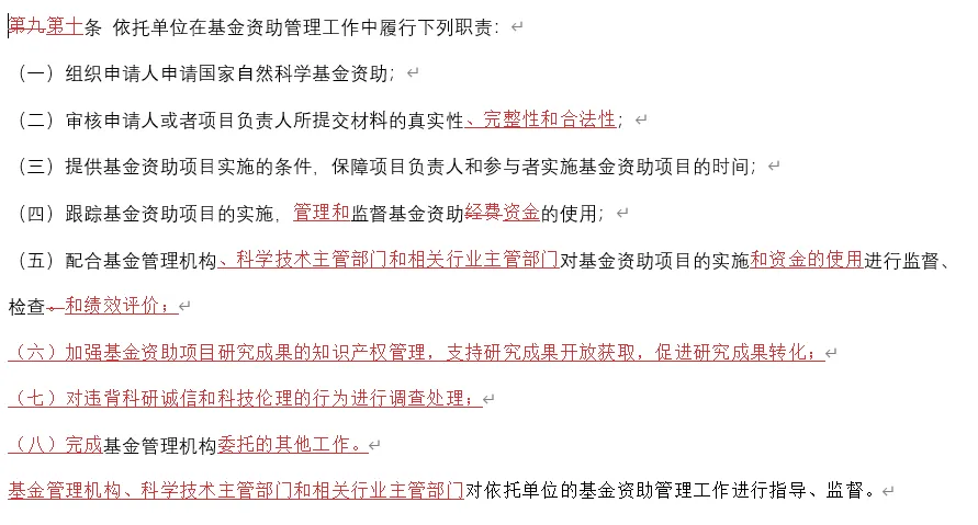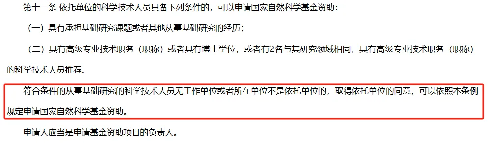 新增第七条:“第七条 基金管理机构应当加强国家自然科学基金工作信息化建设,推动完善科研诚信管理信息共享、基金资助项目成果共享等机制,加强基金资助项目与其他科学技术计划项目的衔接与协调。”原先的第七条仅添加了“支持在科学技术领域取得突出成绩且具有明显创新潜力的青年人才。”并重新分段。原先的第八条虽然内容大改,但和第六条一样,也是属于细化规定的内容,唯一比较特别的是加上了“基金管理机构应当定期公布已注册的依托单位名单。”原先的第九条被增加了3个依托单位的职责,并且依托单位除了要审核申请人或项目负责人所提交材料的真实性以外,还加上了完整性和合法性。原先第十条主要更改了工作单位不是国自然基金依托单位的申请人的申请要求。在这种情况下的最新申请规定为:“符合条件的从事基础研究的科学技术人员无工作单位或者所在单位不是依托单位的,取得依托单位的同意,可以依照本条例规定申请国家自然科学基金资助。”