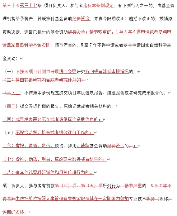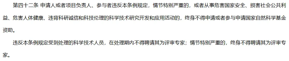 新增第四十二条:“申请人或者项目负责人、参与者违反本条例规定,情节特别严重的,或者从事危害国家安全、损害社会公共利益、危害人体健康、违背科研诚信和科技伦理的科学技术研究开发和应用活动的,终身不得申请或者参与申请国家自然科学基金资助。违反本条例规定受到处理的科学技术人员,在处理期内不得聘请其为评审专家;情节特别严重的,终身不得聘请其为评审专家。”原先第三十九条被简化成了第四十三条:“违反本条例规定,构成违反治安管理行为的,依法给予治安管理处罚;构成犯罪的,依法追究刑事责任。”