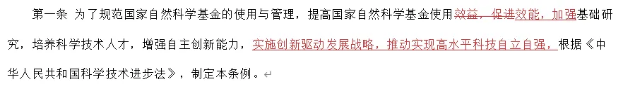 第一条仅是将第二个逗号前的效益改为效能,将第二个逗号后的促进改为加强,并在根据《中华人民共和国科学技术进步法》之前加上了一句“实施创新驱动发展战略,推动实现高水平科技自立自强”。在总则中,算得上是修改得相当少的一条了。第二条基本是完全改掉了。最新的第二条规定为:“国家自然科学基金工作坚持党中央集中统一领导。国家自然科学基金工作应当面向世界科技前沿、面向经济主战场、面向国家重大需求、面向人民生命健康。”原本的第三条现在是第四条,并且将自然人、法人删去,改为地方人民政府、企业。合作方式也从原先单纯的捐资变为除了捐赠还可以“投入资金开展联合资助,建立科技创新合作机制。”原先的第四条,现在是第三条,强调国自然基金资助工作要尊重科学支持人才培养遵循公开、公平、公正的原则。第五条新增“推动基础研究自由探索和目标导向有机结合,根据基金发展规划和年度基金项目指南予以确定。”