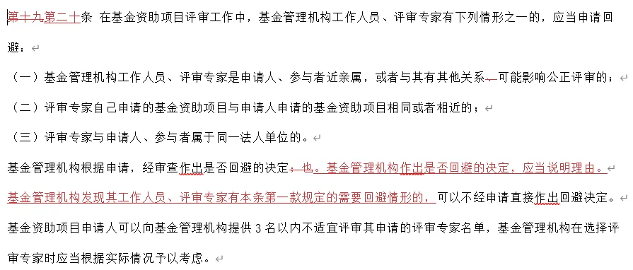 本次修改对于原先的第十九天仅在基金管理机构在处理评审专家回避与否的具体操作上进行了细化说明。面对回避申请不论同意与否,都要说明理由。管理机构在发现其工作人员、评审专家有本条第一款规定的需要回避情形的可直接作出回避决定。也就是说评审专家与申请人、参与者属于同一法人单位未必会需要回避。