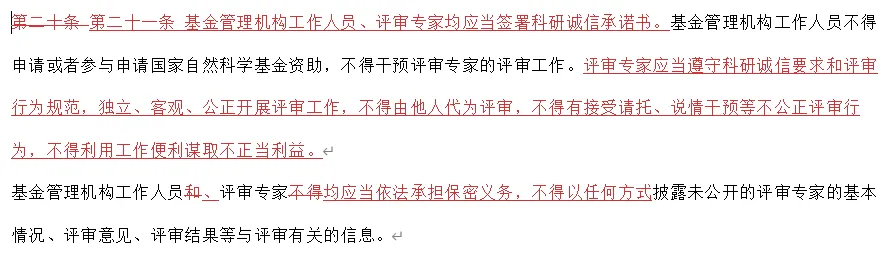 原先第二十条添加了两句:“基金管理机构工作人员、评审专家均应当签署科研诚信承诺书。”“评审专家应当遵守科研诚信要求和评审行为规范,独立、客观、公正开展评审工作,不得由他人代为评审,不得有接受请托、说情干预等不公正评审行为,不得利用工作便利谋取不正当利益。”原先第二十一条增加了一句:“申请人收到基金管理机构的基金资助通知后,即作为基金资助项目的负责人组织开展研究工作。”