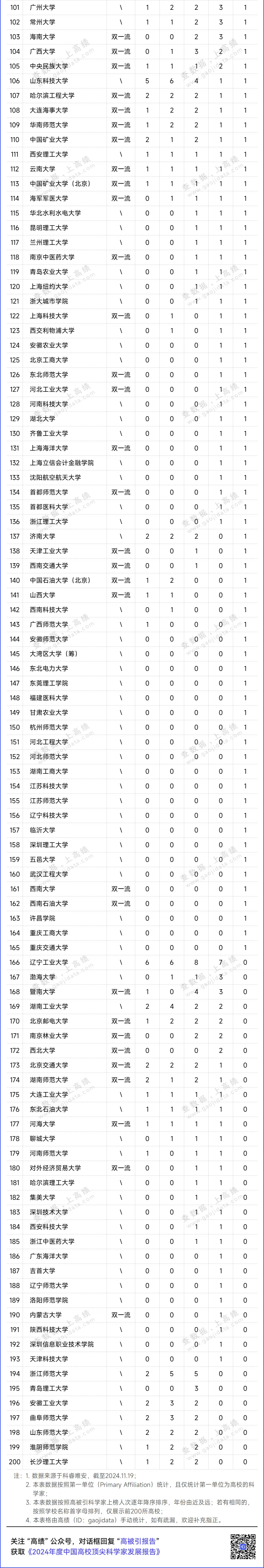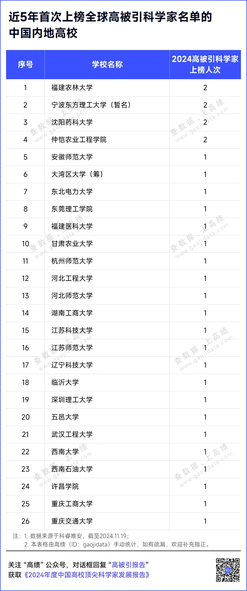 还有26所高校厚积薄发,5年来首次有学者上榜高被引科学家名单,实现历史性突破。如福建农林大学、宁波东方理工大学(暂名)、沈阳药科大学和仲恺农业工程学院,各新增2人次;其余22所高校各新增1人次。
