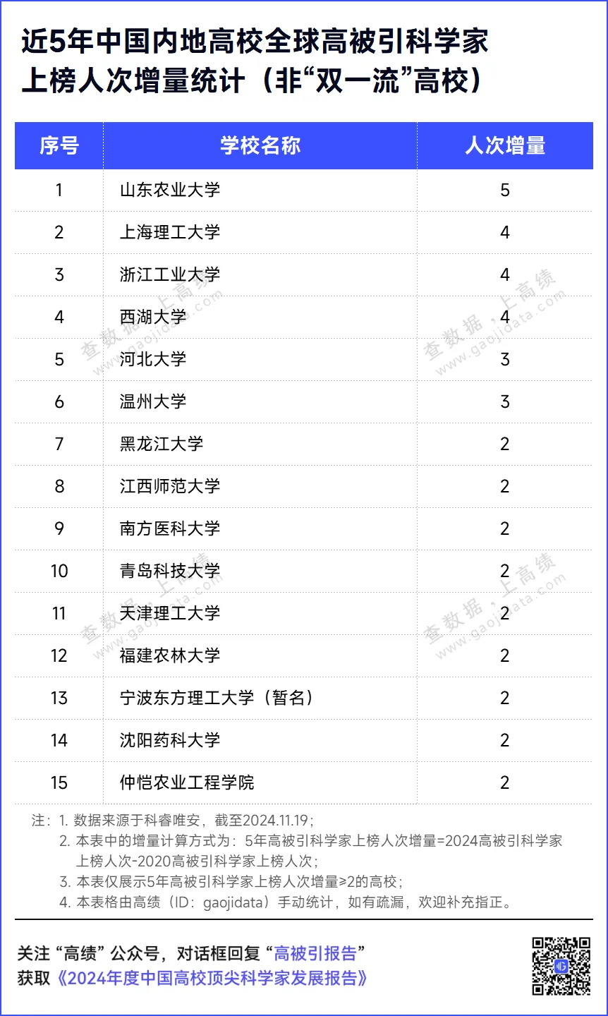 非“双一流”高校中,进步最大的是山东农业大学,共增加5人次。其次是上海理工大学、浙江工业大学和西湖大学,分别增加4人次。