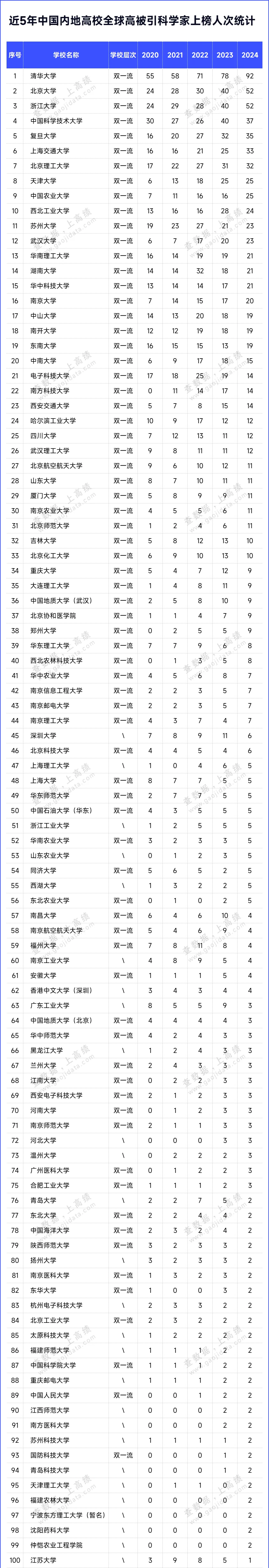 高绩(ID:gaojidata)统计了2020-2024年中国内地高校入选全球高被引科学家的人次,以展示各高校近年来的进步与变化。统计结果如下图: