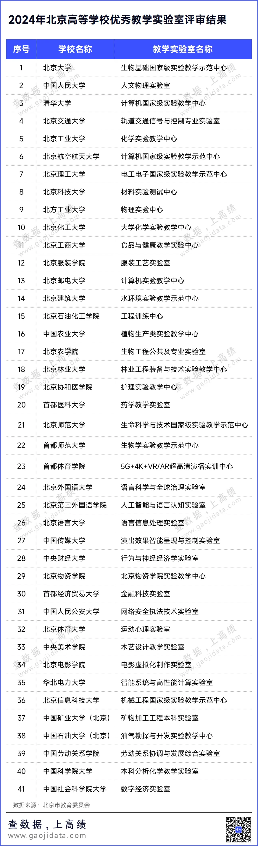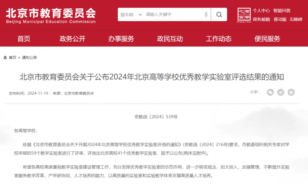 11月19日,北京市教育委员会发布《北京市教育委员会关于公布2024年北京高等学校优秀教学实验室评选结果的通知》。