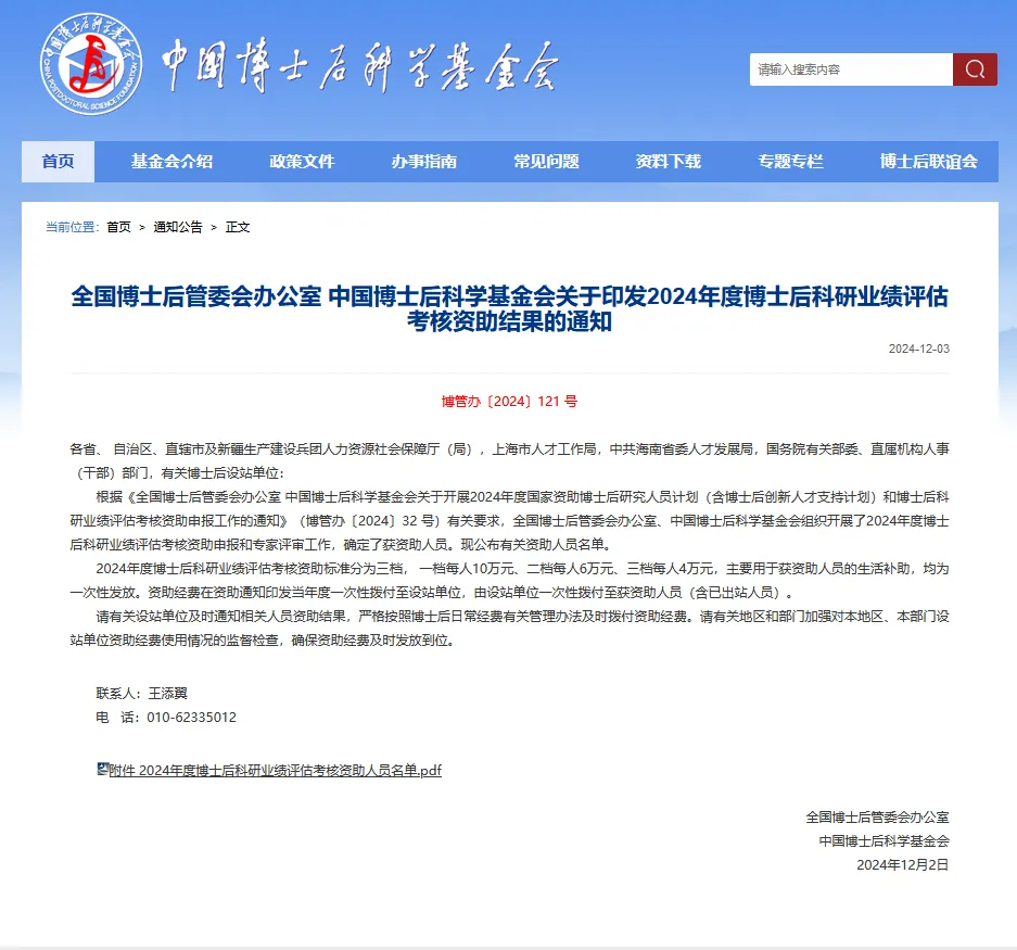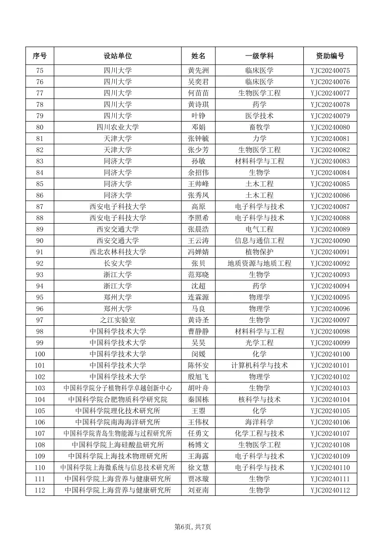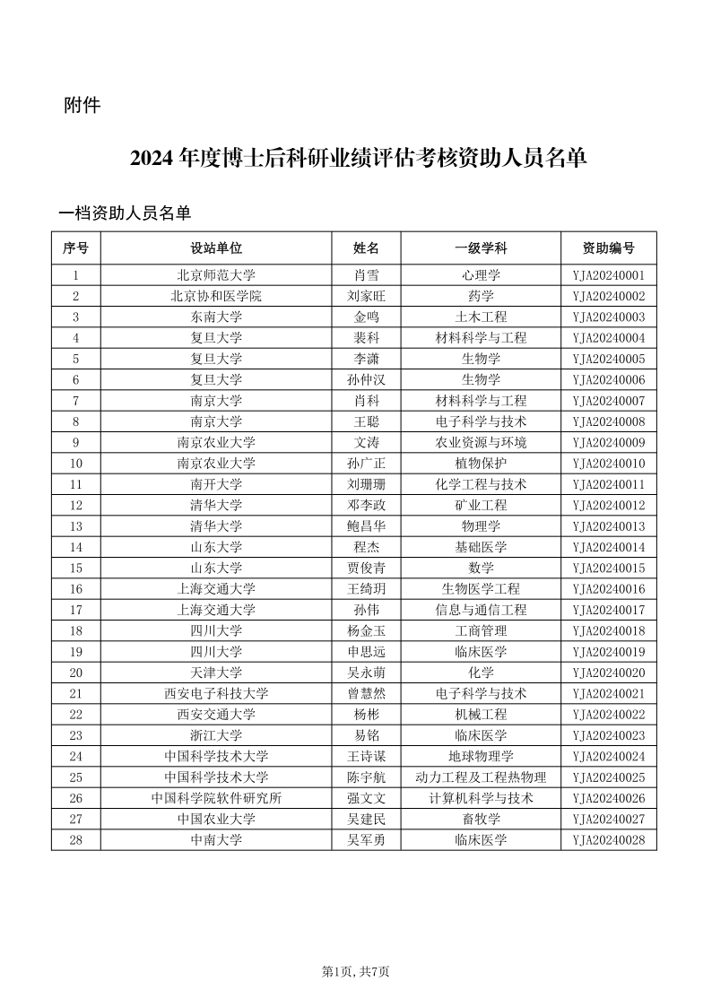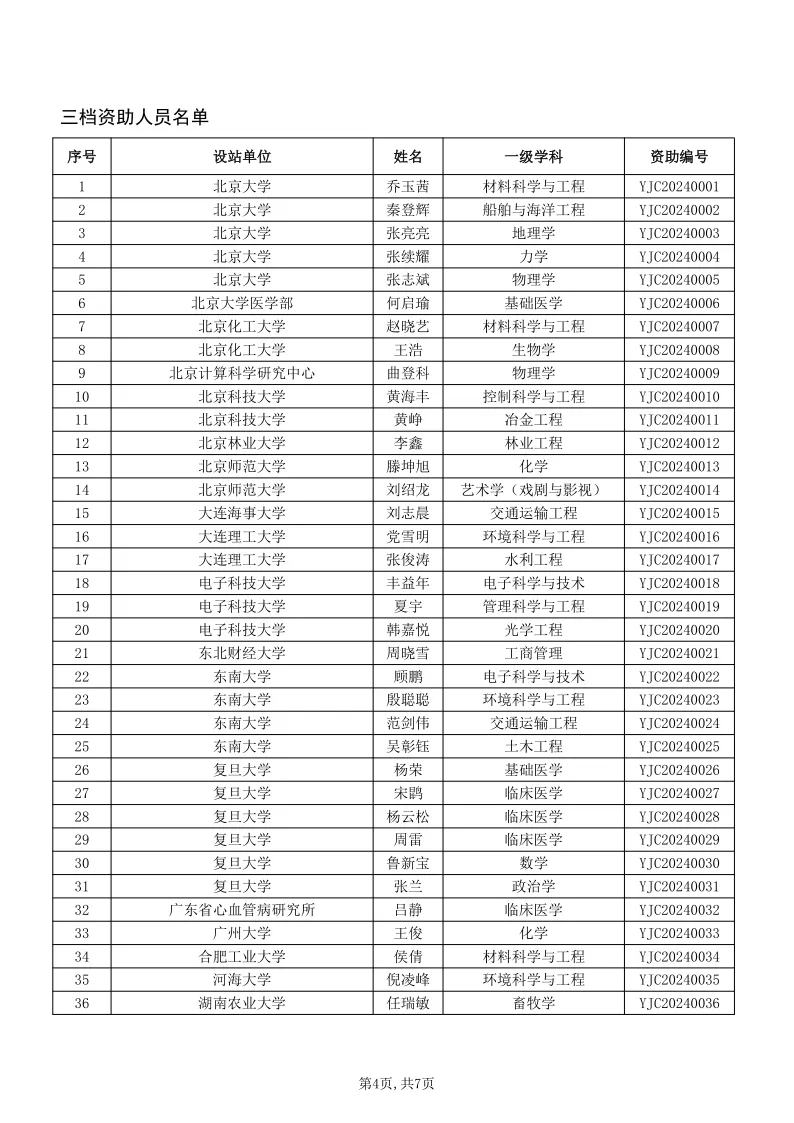 12月3日,中国博士后科学基金会官网发布了《全国博士后管委会办公室 中国博士后科学基金会关于印发2024年度博士后科研业绩评估考核资助结果的通知》。 2024年度博士后科研业绩评估考核资助标准分为三档, 一档每人10万元、二档每人6万元、三档每人4万元,主要用于获资助人员的生活补助,均为一次性发放。资助经费在资助通知印发当年度一次性拨付至设站单位,由设站单位一次性拨付至获资助人员(含已出站人员)。 本次总资助人数212人,共涉及89个单位52个一级学科。其中,中国科学技术大学以总数12人位居榜首,其次是复旦大学、四川大学分别是11人,山东大学、中南大学分别是9人。获资助的一级学科中,临床医学以总数20人位居第一,生物学18人,材料科学与工程12人,化学11人,电子科学与技术10人。 一档共资助28人,涉及19个单位。其中复旦大学有3人,南京大学、南京农业大学、清华大学、山东大学、上海交通大学、四川大学、中国科学技术大学分别有2人。获资助的一级学科共有23个,其中临床医学最多有3人,其次是材料科学与工程、电子科学与技术、生物学分别有2人。 二挡共资助55人,涉及38个单位。其中中国科学技术大学以总数5人位居榜首,山东大学、中国科学院大学、中南大学分别是3人次之,北京大学、东南大学、复旦大学、清华大学、上海交通大学医学院、同济大学、浙江大学分别有2人。获资助的30个一级学科中,临床医学、生物学分别有5人,材料科学与工程、化学、环境科学与工程分别有3人。 三挡共资助129人,涉及68个单位。其中四川大学9人,位居榜首,其次是复旦大学6人,北京大学、中国科学技术大学、中南大学分别是5人。获资助的47个一级学科中,临床医学以12人位居榜首,其次是生物学11人,材料科学与工程、化学分别是7人。 详细名单如下