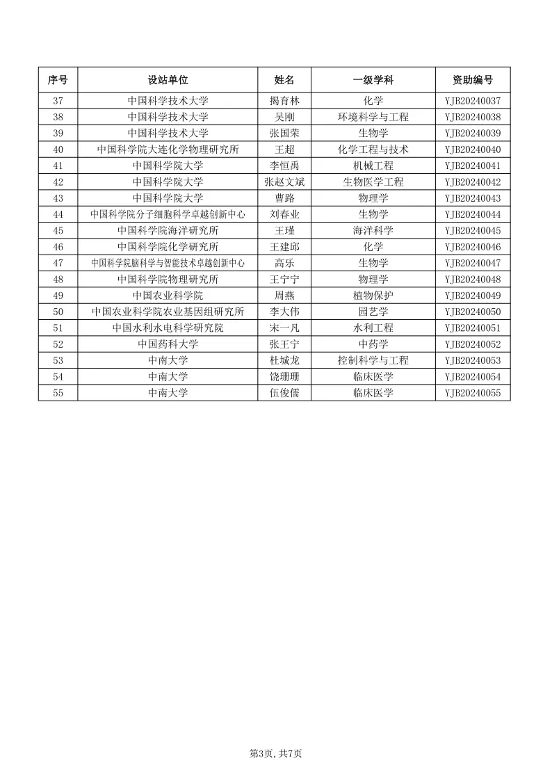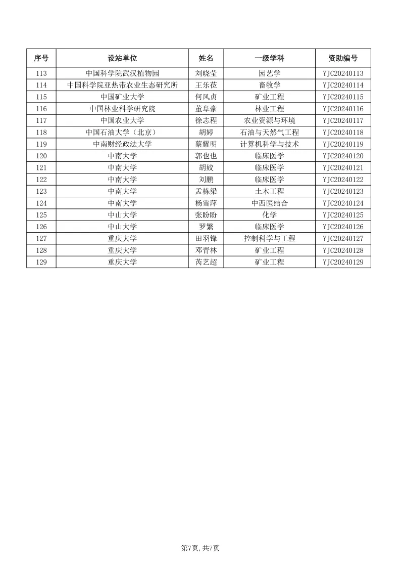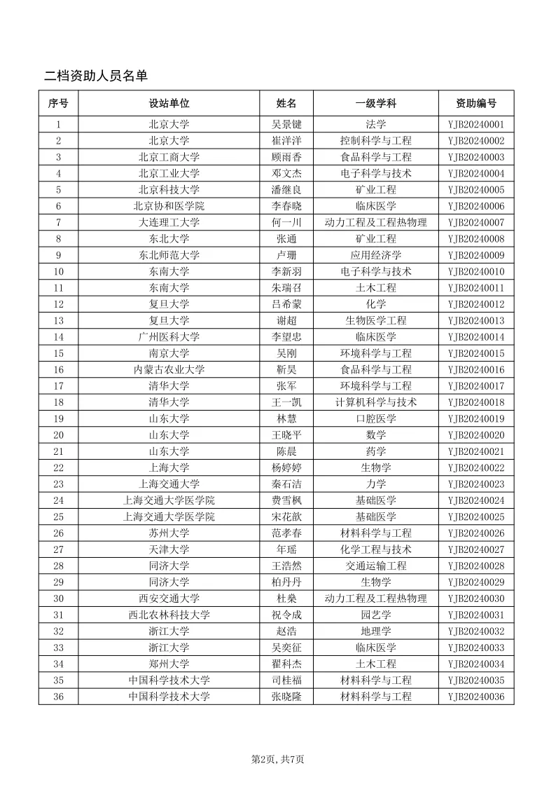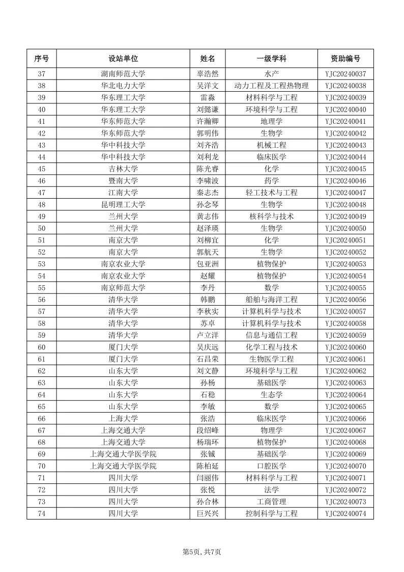 12月3日,中国博士后科学基金会官网发布了《全国博士后管委会办公室 中国博士后科学基金会关于印发2024年度博士后科研业绩评估考核资助结果的通知》。 2024年度博士后科研业绩评估考核资助标准分为三档, 一档每人10万元、二档每人6万元、三档每人4万元,主要用于获资助人员的生活补助,均为一次性发放。资助经费在资助通知印发当年度一次性拨付至设站单位,由设站单位一次性拨付至获资助人员(含已出站人员)。 本次总资助人数212人,共涉及89个单位52个一级学科。其中,中国科学技术大学以总数12人位居榜首,其次是复旦大学、四川大学分别是11人,山东大学、中南大学分别是9人。获资助的一级学科中,临床医学以总数20人位居第一,生物学18人,材料科学与工程12人,化学11人,电子科学与技术10人。 一档共资助28人,涉及19个单位。其中复旦大学有3人,南京大学、南京农业大学、清华大学、山东大学、上海交通大学、四川大学、中国科学技术大学分别有2人。获资助的一级学科共有23个,其中临床医学最多有3人,其次是材料科学与工程、电子科学与技术、生物学分别有2人。 二挡共资助55人,涉及38个单位。其中中国科学技术大学以总数5人位居榜首,山东大学、中国科学院大学、中南大学分别是3人次之,北京大学、东南大学、复旦大学、清华大学、上海交通大学医学院、同济大学、浙江大学分别有2人。获资助的30个一级学科中,临床医学、生物学分别有5人,材料科学与工程、化学、环境科学与工程分别有3人。 三挡共资助129人,涉及68个单位。其中四川大学9人,位居榜首,其次是复旦大学6人,北京大学、中国科学技术大学、中南大学分别是5人。获资助的47个一级学科中,临床医学以12人位居榜首,其次是生物学11人,材料科学与工程、化学分别是7人。 详细名单如下