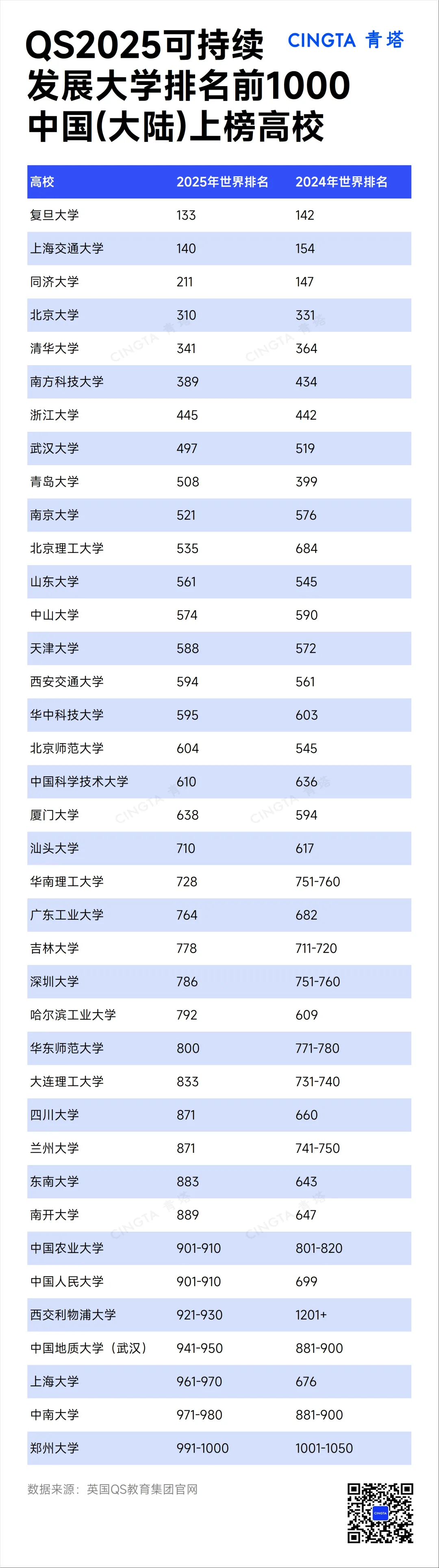 全球高等教育分析机构QS Quacquarelli Symonds(QS)发布了QS2025世界大学可持续发展排名。