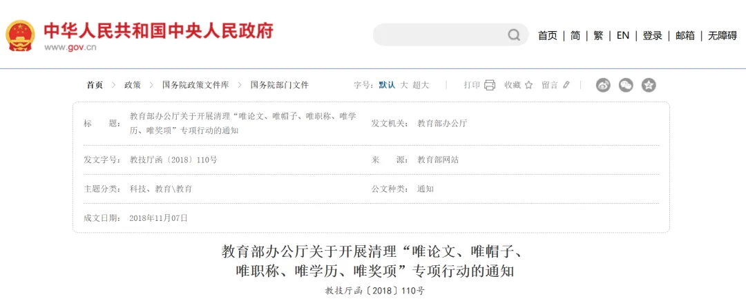 2018年11月,教育部办公厅印发了《关于开展清理“唯论文、唯帽子、唯职称、唯学历、唯奖项”专项行动的通知》,“破五唯”改革正式启动。