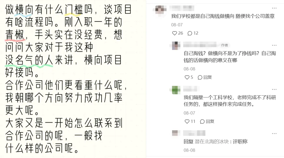 此外,近年来高校掀起一股拉横向之风。横向项目作为高校科研活动的重要组成部分,同样让很多教师为此疲于奔命。重视科研成果转化是大势所趋,有一些高校明确将横向项目纳入教师职称评审的要求中,而横向项目的获取往往与教师的社会关系、人脉资源等因素也有一定关系。各项指标要求下,有老师开始自己导演项目:为了评职称,自己掏钱做横向。