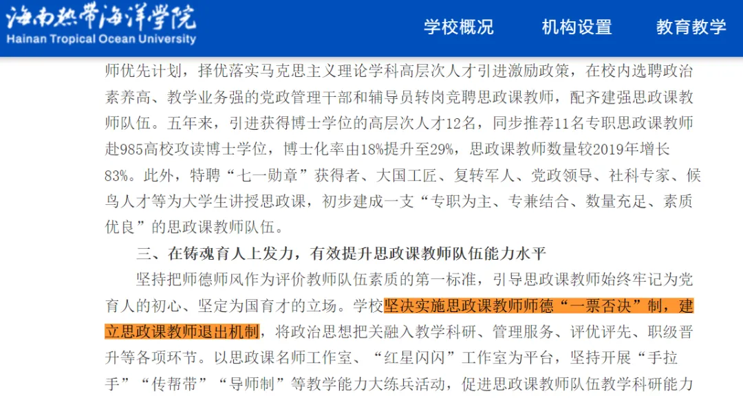 3月份,海南热带海洋学院发文表示学校坚决实施思政课教师师德“一票否决”制,建立思政课教师退出机制。将政治思想把关融入教学科研、管理服务、评优评先、职级晋升等各项环节。