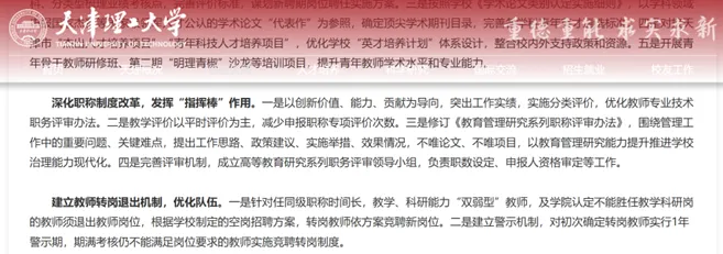今年2月份,天津理工大学发文提到,建立教师转岗退出机制,优化队伍。一是针对任同级职称时间长,教学、科研能力“双弱型”教师,及学院认定不能胜任教学科研岗的教师须退出教师岗位,根据学校制定的空岗招聘方案,转岗教师依方案竞聘新岗位。二是建立警示机制,对初次确定转岗教师实行1年警示期,期满考核仍不能满足岗位要求的教师实施竞聘转岗制度。