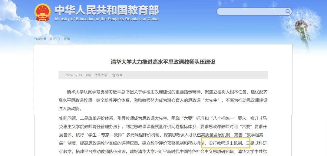 近日,教育部发文《清华大学大力推进高水平思政课教师队伍建设》,文中提到清华大学强化组织领导,规划队伍建设,建立教学评价预警机制和帮扶机制,实行教师退出机制。