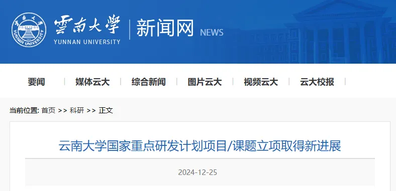 12月25日,云南大学新闻网发布消息,学校本年度获批立项国家重点研发计划项目2项、课题7项,研究领域涵盖天文、材料、生态、地学和生物学等学科。