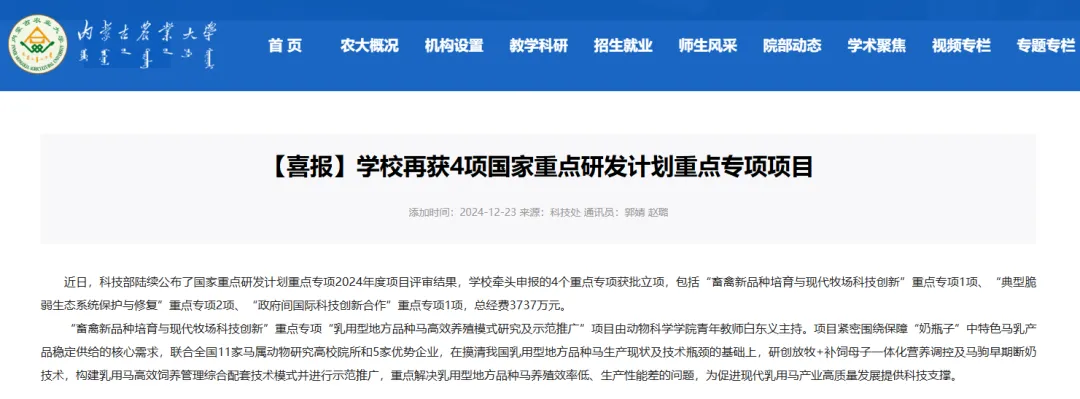 12月23日,据内蒙古农业大学官网消息,学校牵头申报的4个重点专项获批立项,包括“畜禽新品种培育与现代牧场科技创新”重点专项1项、“典型脆弱生态系统保护与修复”重点专项2项、“政府间国际科技创新合作”重点专项1项,总经费3737万元。