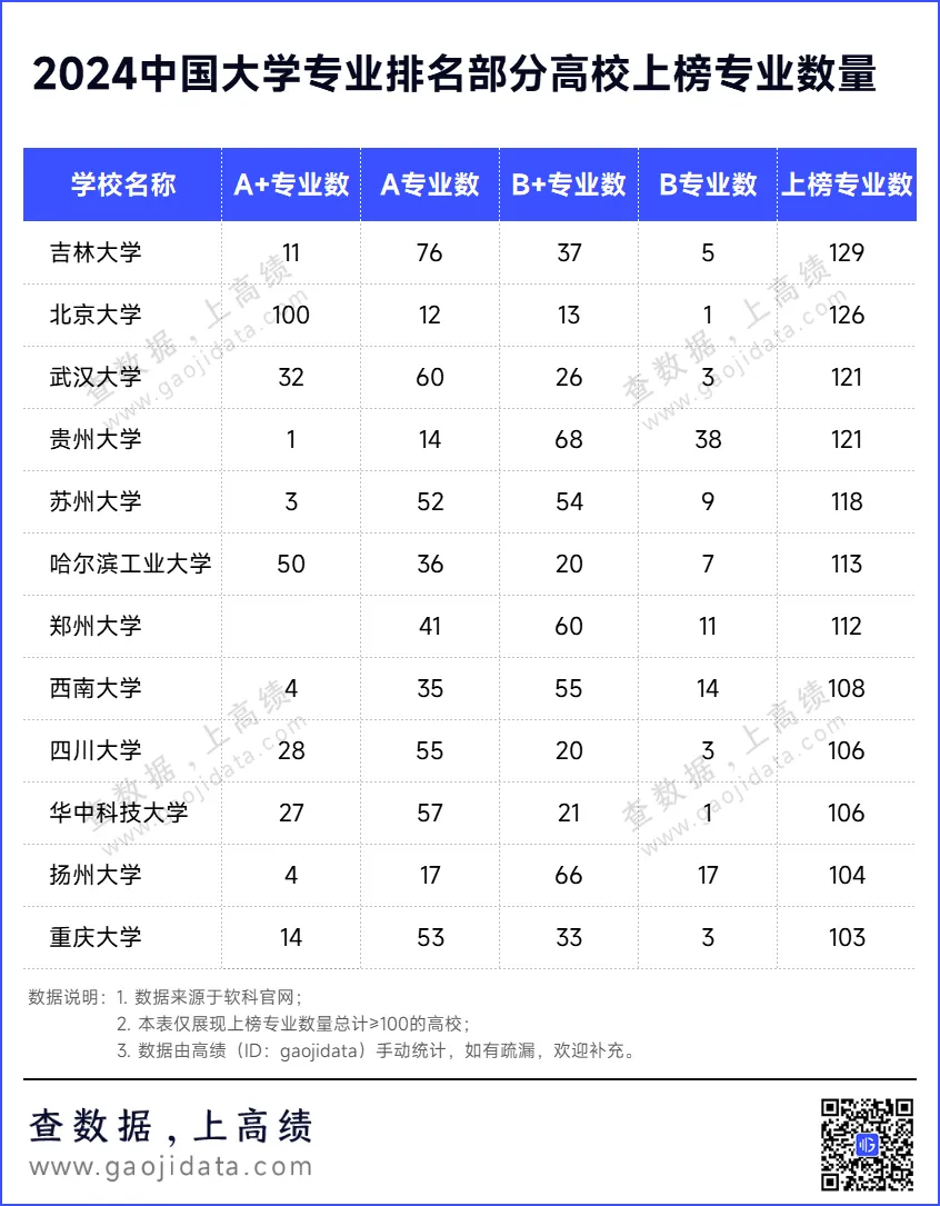 按照上榜专业数统计,吉林大学有129个专业上榜,领先国内其它高校;北京大学以126个上榜专业紧随其后;武汉大学和贵州大学则以121个上榜专业并列全国第三。