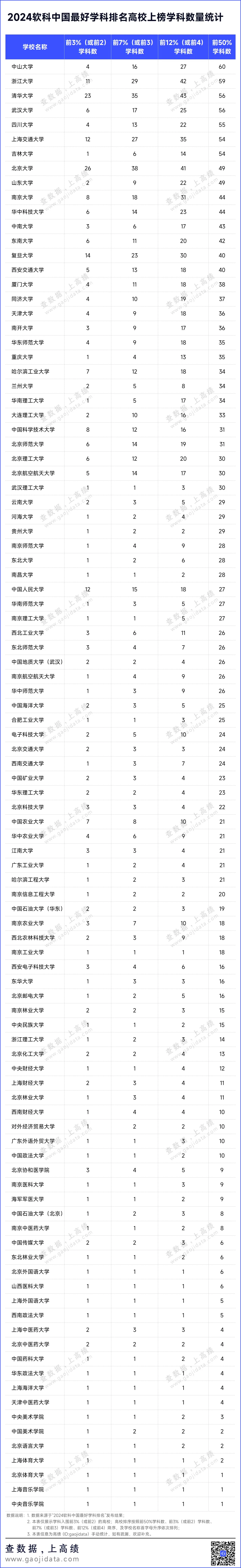 学科建设是提高学校办学水平和人才培养质量的关键。在2024软科中国最好学科排名中,按照上榜学科数量统计,中山大学和浙江大学分别有60个和59个学科上榜,领先国内其它高校,清华大学和武汉大学紧随其后,各有56个学科上榜,四川大学有55个学科上榜。