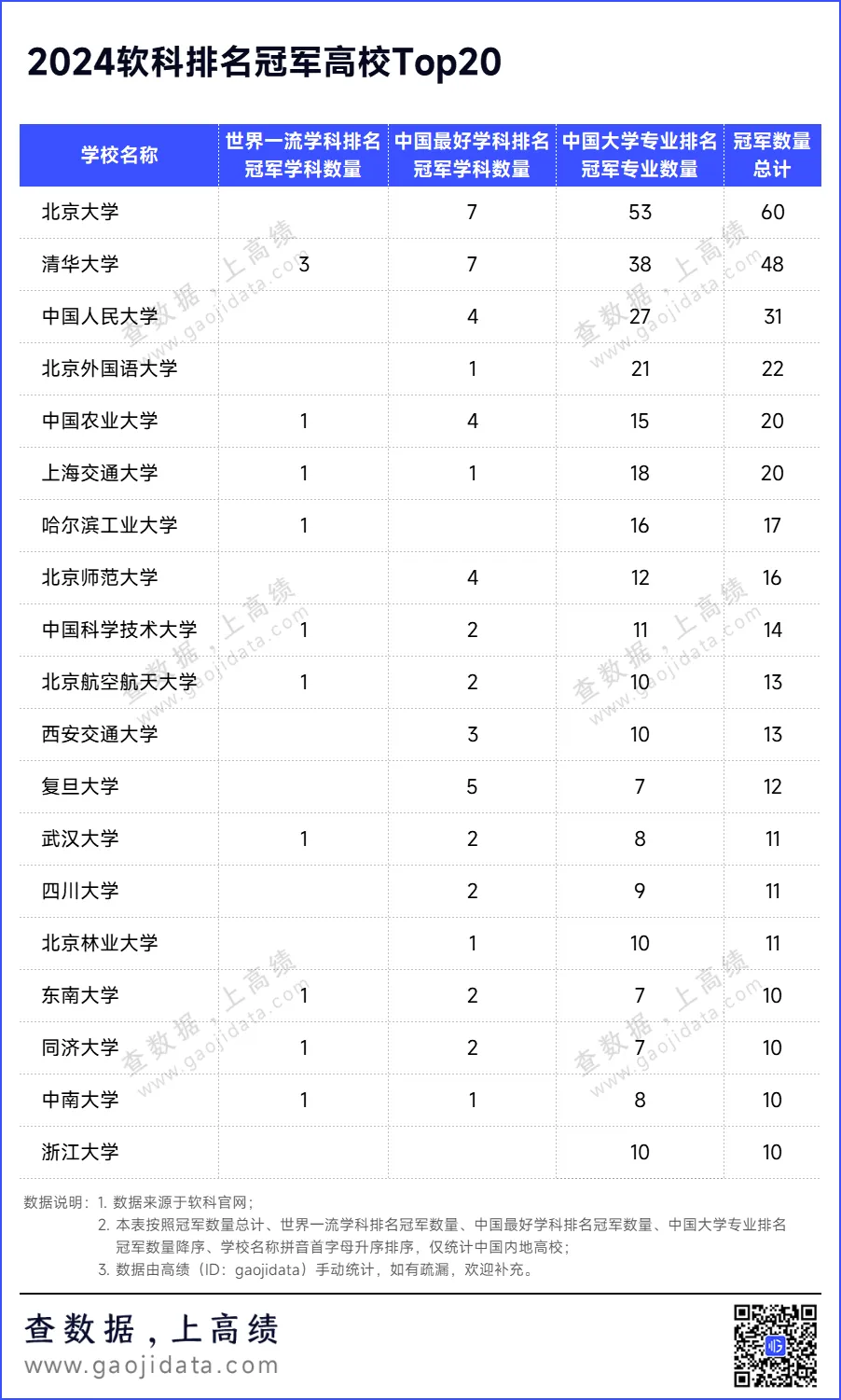北京大学在中国大学专业排名和中国最好学科排名中,拥有的冠军数量最多,其中,冠军专业53个,冠军学科7个,实力不凡。