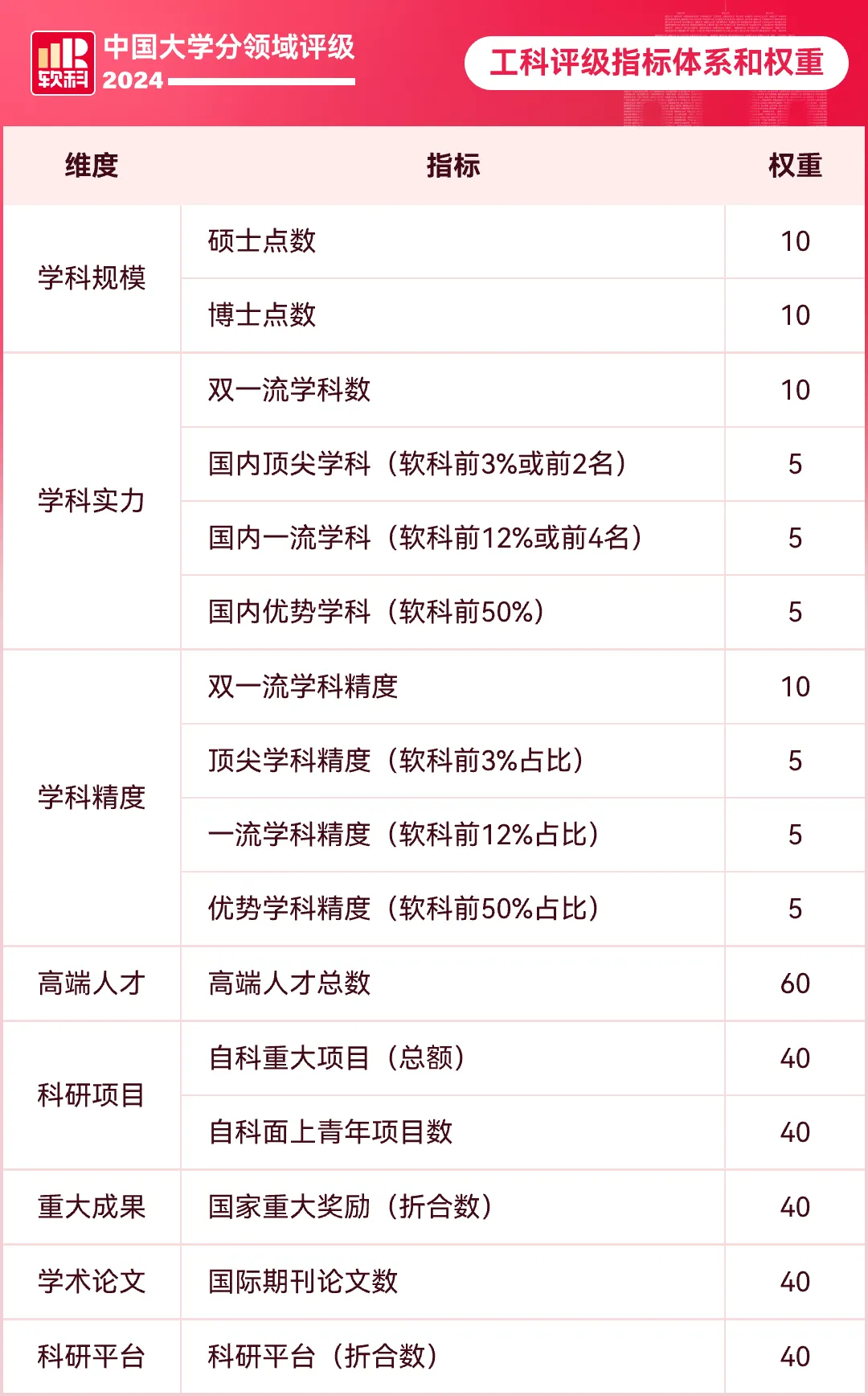 中国大学工科实力评级包含学科规模、学科实力、学科精度、高端人才、科研项目、重大成果、学术论文和科研平台8个维度,16项指标。