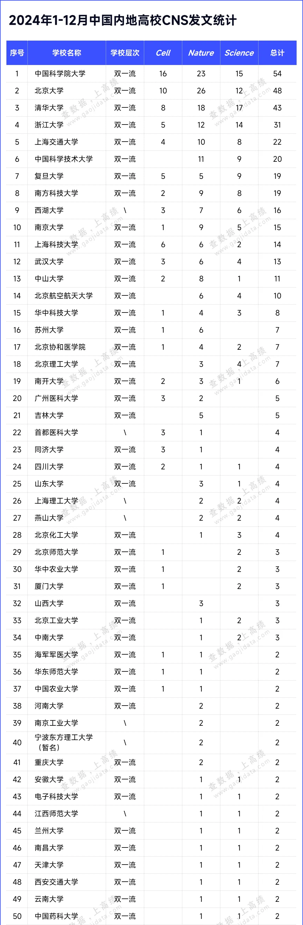 高绩(ID:gaojidata)重磅发布《2024年中国内地高校顶刊发文年鉴》,汇总了2024一整年以来,中国内地高校作为通讯作者(含共同通讯作者单位)在三大国际顶刊:Cell、Nature和Science(简称CNS)期刊,总计刊出原创论文情况,以总结与展示一年来高校在国际科研创新领域的突出贡献。