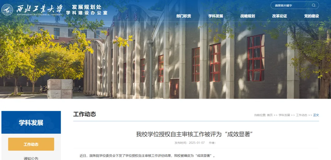 今年1月7日,西北工业大学官宣,国务院学位委员会反馈学位授权自主审核工作成效评估结果中,学校学位授权自主审核工作被确定为“成效显著”。