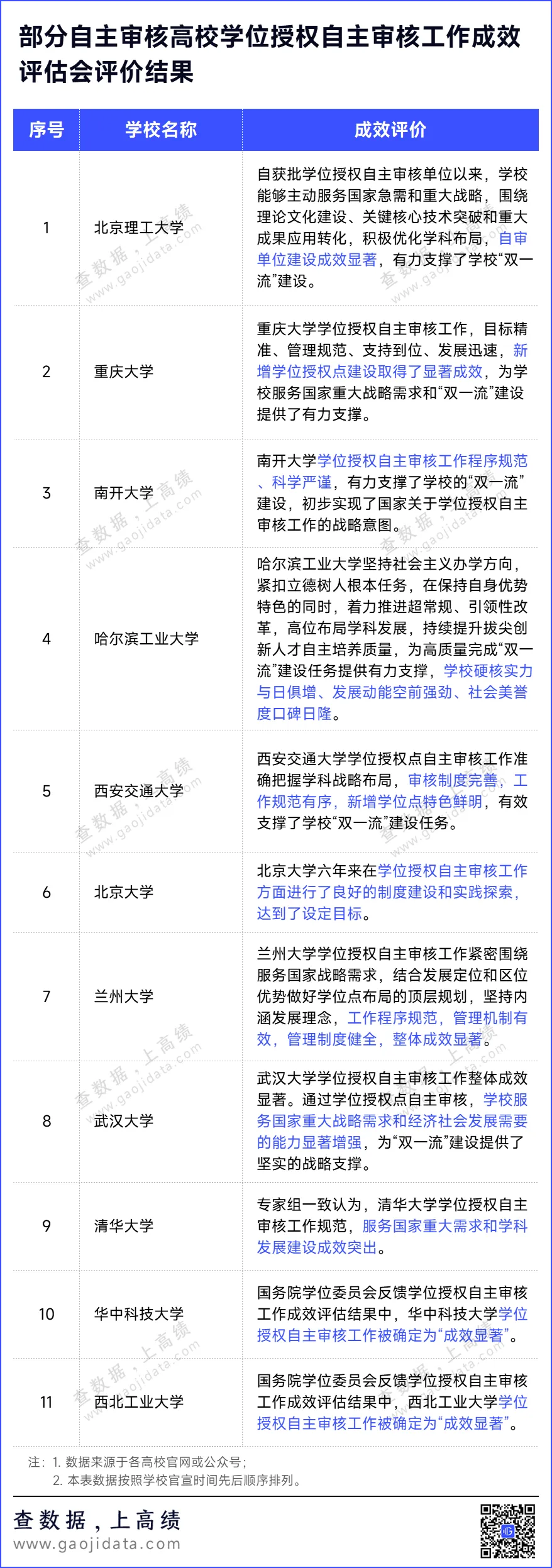 据不完全整理,北京理工大学等11所高校陆续召开了学位授权自主审核工作成效评估会。此次评估,是自2018年公布第一批学位授权自主审核单位以来,获批高校进行的首次工作成效评估。