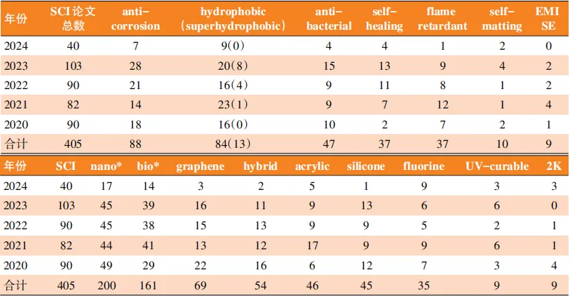 近5年水性聚氨酯涂料学术研究 Academic Research on Waterborne Polyurethane Coatings in The Past 5 Years 王武生 (安徽大学化学化工学院,合肥230601) 摘要: 为了帮助读者更好地了解最近几年水性聚氨酯涂料学术研究领域学者都做了些什么。本文系统统计和分析了近5年来发表的关于水性聚氨酯涂料的SCI论文。 关键词: 水性聚氨酯;涂料;防腐;抗菌;自消光;自修复;阻燃 本文作为参考文献标准著录格式: 王武生. 近5年水性聚氨酯涂料学术研究[J]. 涂料工业,2024,54(增刊1):6-13. WANG W S. Academic research on waterborne polyurethane coatings in the past 5 years[J]. Paint & Coatings Industry,2024,54(Suppl. 1):6-13. 受《涂料工业》邀请,约我写一篇“水性聚氨酯涂料研究最新进展”文章用于《涂料工业》近期出版的专刊发表。最初我是一口答应,但一旦动笔,却觉得千难万难。各个领域的学术研究其实都有一个普遍现象,存在重大突破而带来的学术高峰期和其后较长时间的低潮期。水性聚氨酯涂料学术研究目前恰恰处于这种到处寻寻觅觅,四处探索,没有具体方向,试图寻找突破的低潮期,缺乏有价值的重大突破。对于这种到处寻觅,零零碎碎的研究并不存在所谓的实质性重大进展。为了论文可读性,本文将采用近年来国外流行的一种综述写法:按一定标准全面完整地搜集文献,对文献报道进行统计分析。目的仅是告诉读者,最近几年水性聚氨酯涂料学术研究者都做了些什么。 科学技术研究,通常存在两条线:一条线就是所谓的学术研究,通过系统性的方法和过程,对某一特定的主题或问题进行探索,以获得新的见解、知识和理论。学术研究最终表现为发表学术论文。另一条线就为应用研究与工业开发,利用学术研究获得的成果,进行工业应用研究工程开发,将学术研究转化为生产力。然而对于水性聚氨酯似乎并不符合这种规律,历史上就已经打破了这个规律。比如水性聚氨酯开拓性突破的2项技术,内乳化工艺,以及后来的重大发明水性双组分聚氨酯涂料,都是由企业开发,形成产品后才由大学研究院学者补充学术研究完善其背后的理论。另一方面对于目前水性聚氨酯学术研究与工业开发总有点渐行渐远的感觉。当然这并不是学术研究的问题,学术研究本该如此,学术研究就像寻矿,到处漫无目地挖掘试探,说不定哪天就找到价值连城的矿藏。 1 水性聚氨酯涂料学术研究 前面说过,学术研究最终表现形式为学术论文,近5年全世界发表的关于水性聚氨酯涂料研究的学术论文成千上万。好在现代网络已经为我们提供了简便快速的索引查询工具以及数据库,如Google学术、百度学术、WebofScience(SCI)、CAS(SciFinder)等。对比这些查询工具和数据库,对于这篇论文,WebofScience最合适,因为它整合了SCI(sciencecitationindex)、SSCI(socialsciencecitationindex以及AHCI(arts&humanitiescitaionindex),是利用互联网开放环境,创建的全球最大、覆盖学科最多的综合性学术信息资源数据库。其中SCI(科学引文索引)收录的是国际顶尖科学技术学术期刊发表的学术论文。追求的不是数量而是质量。虽然只收录了不到5%左右的学术论文,但完全可以代表现有科学技术发展学术水平。 对于水性聚氨酯的专业术语,早期常采用“aqueouspolyurethanedispersions(aq.PUD)”,也有人喜欢用“water-basedpolyurethane”,但目前主流采用“waterbornepolyurethane”。采用这3个关键词+coatings为搜索关键词,在WebofScience中搜索2020—2024年被收录的关于水性聚氨酯涂料的论文,共获得792篇。对搜寻结果进一步人工筛选,排除符合度较低的以及综述论文,最终选择出405篇关联性较高的学术研究论文。 纵观这405篇代表现在最高学术水平的论文,与20世纪80—90年代此领域学术论文比较,总体感觉缺少了点学术气息。表面上看似乎学术研究与工业开发有同质化现象。学术研究也是在寻找方法做出符合实际需要的新型涂料、功能性涂料,只是学术研究少了许多现实因素的羁绊,无需考虑成本、工艺可行性以及法律法规,探索的面更为广泛,但也易脱离实际,与工业应用开发渐行渐远。还有或许是发表论文的压力,学术研究讲究的是新、奇、特,过于追寻热点,如添加纳米材料、石墨烯、量子点、MOF等,有些明显没有实用前景。 在初步浏览405篇学术论文摘要后,可以从宏观大致了解学术研究在做什么。在初步浏览的基础上,在搜索结果中增加新关键词进行二次搜索。对于研究目的,增加与研究目的有关的关键词如anticorrosion(防腐)、flameretardant(阻燃)、self-healing(自修复)等;而对于研究手段,采用hybrid(杂化)、nano(纳米)、graphene(石墨烯)等关键词。查询结果见表1。 表1 2020—2024年水性聚氨酯涂料发表论文统计 水性聚氨酯涂料防腐性能相对较弱,极大程度上限制了其在工业涂料领域中的应用,提升水性聚氨酯涂料防腐性能无疑是研究热点。在405篇论文中,涉及防腐的达88篇。提升涂料防腐保护主要有3种方式,即屏蔽(阻隔)防腐、钝化防腐和电化学防腐。然而在水性聚氨酯涂料防腐研究中,大部分论文涉及的是屏蔽(阻隔)防腐,钝化防腐和电化学防腐论文相对较少。 提升水性聚氨酯涂层阻隔性的方式主要有提升涂层致密性,提升涂层疏水性,提升水性聚氨酯涂料对基材附着力以及损伤后自修复。近5年涉及水聚氨酯涂料防腐论文中有51篇论文涉及纳米材料改性;19篇为引入有机硅、有机氟、油脂等疏水基团,提升涂料疏水性;12篇涉及自修复。 纳