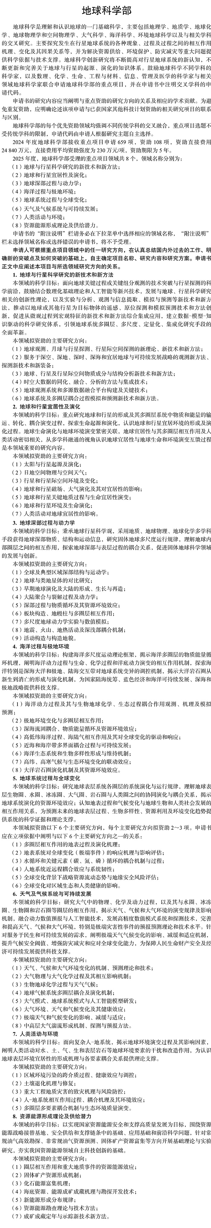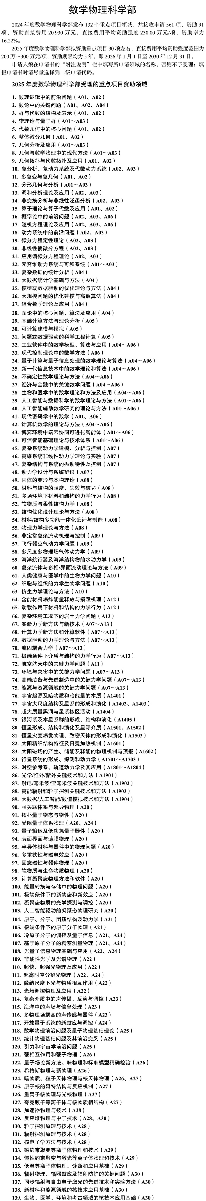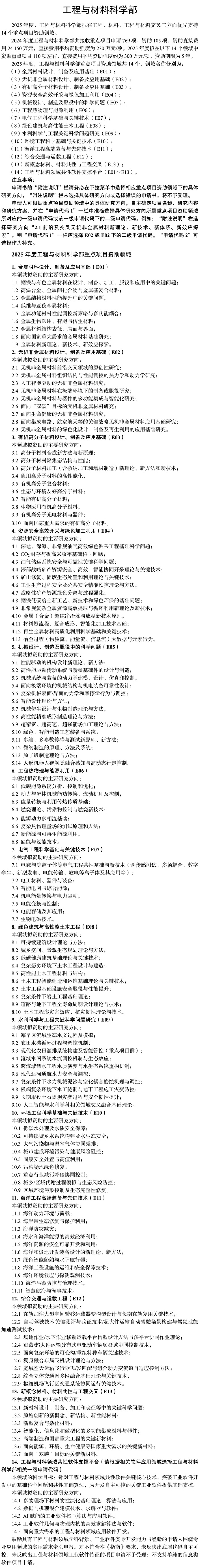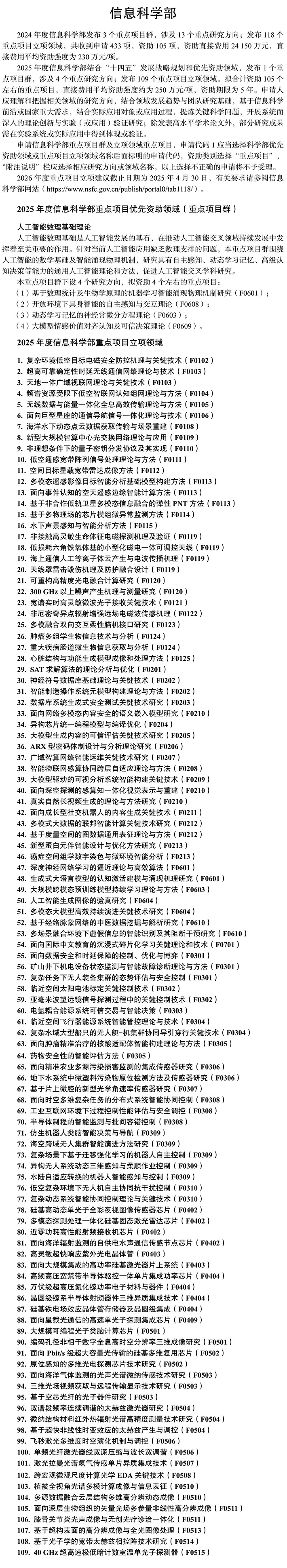近日,《2025年度国家自然科学基金项目指南》正式发布,其中重点项目支持从事基础研究的科学技术人员针对已有较好基础的研究方向或学科生长点开展深入、系统的创新性研究,促进学科发展,推动若干重要领域或科学前沿取得突破。对指南中各学部重点项目的优先资助领域进行了梳理,仅供参考。具体内容请参见国家自然科学基金委员会官方网站