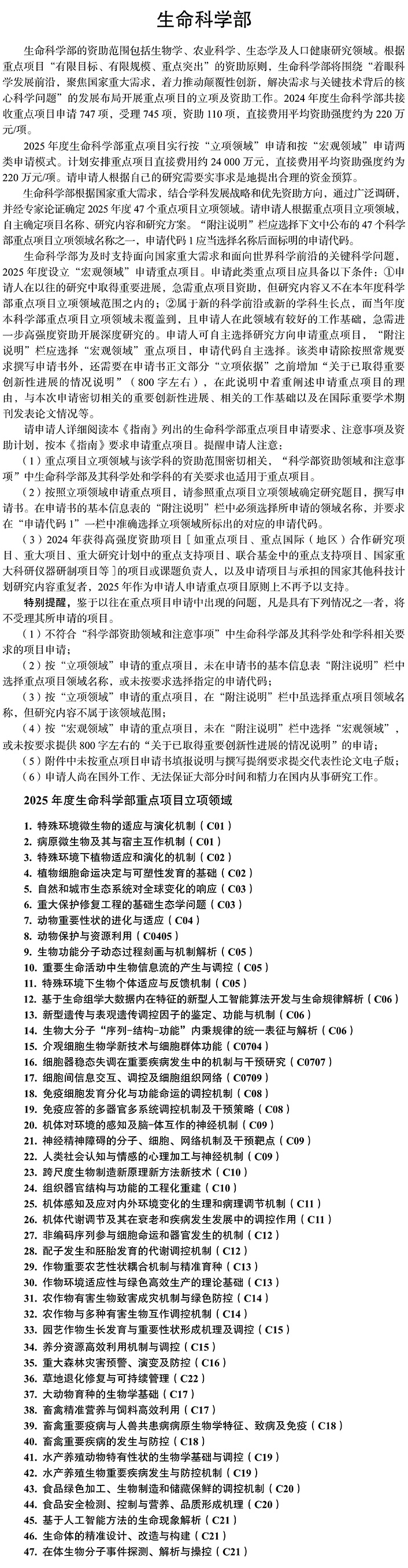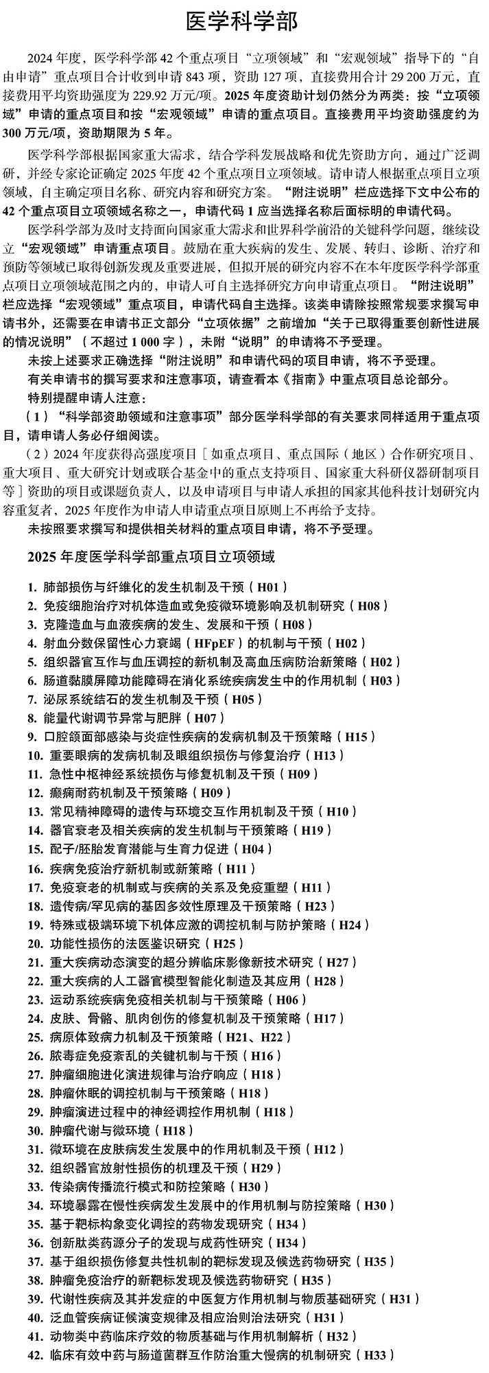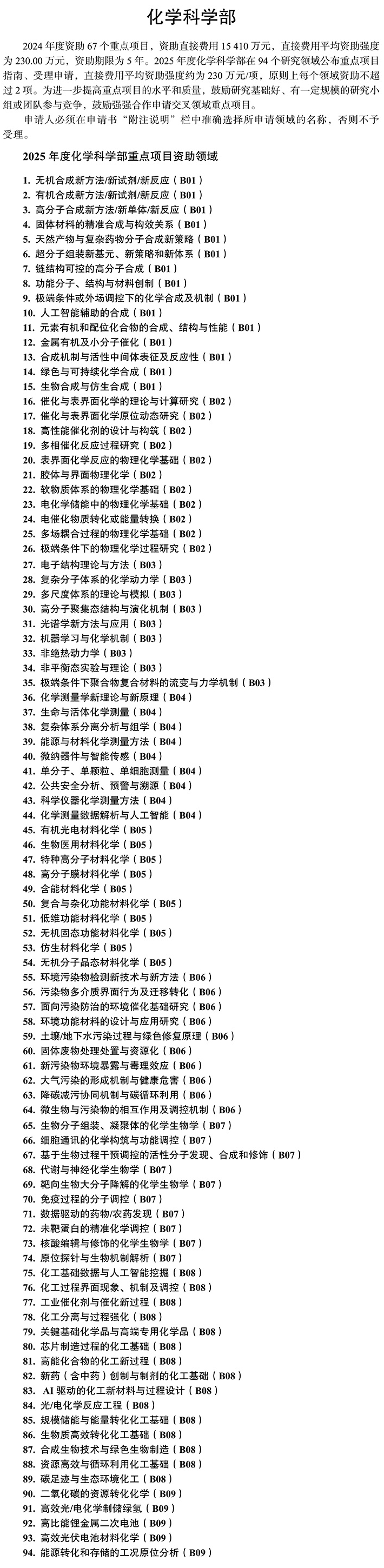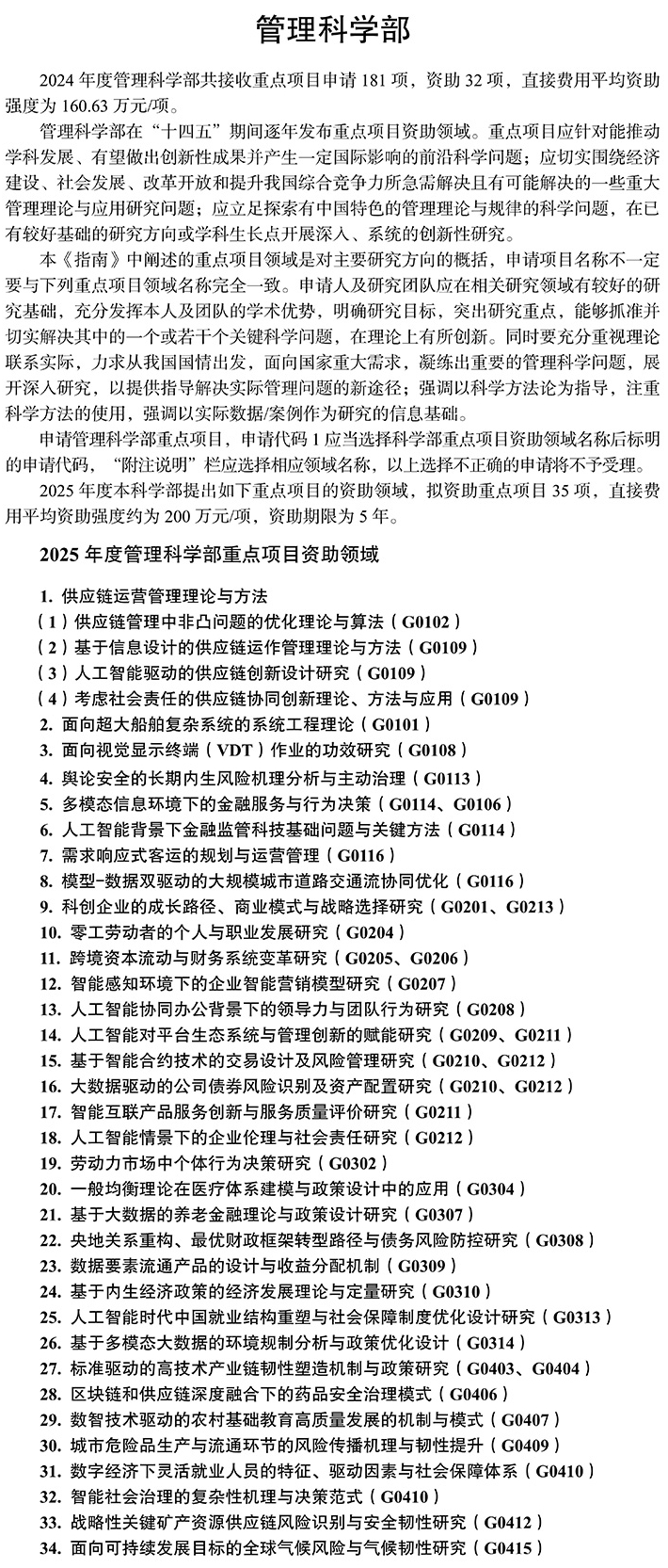 近日,《2025年度国家自然科学基金项目指南》正式发布,其中重点项目支持从事基础研究的科学技术人员针对已有较好基础的研究方向或学科生长点开展深入、系统的创新性研究,促进学科发展,推动若干重要领域或科学前沿取得突破。对指南中各学部重点项目的优先资助领域进行了梳理,仅供参考。具体内容请参见国家自然科学基金委员会官方网站