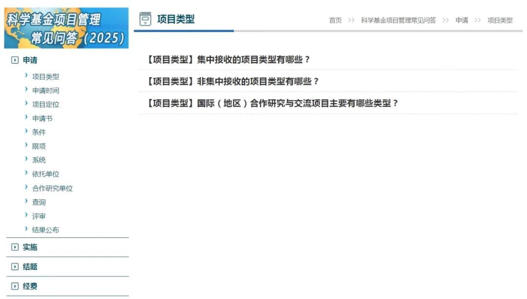2025 年度集中接收申请的项目类型包括:面上项目、重点项目、重点国际(地区)合作研究项目、青年科学基金项目(C 类)[原青年科学基金项目]、地区科学基金项目、青年科学基金项目(B 类)[原优秀青年科学基金项目]、青年科学基金项目(A 类)[原国家杰出青年科学基金项目]、青年科学基金项目(A 类延续资助)[原国家杰出青年科学基金延续资助项目]、创新研究群体项目、卓越研究群体项目(原基础科学中心项目)、外国学者研究基金项目、合作创新研究团队项目、数学天元基金项目、国家重大科研仪器研制项目(自由申请)、部分联合基金项目、部分重大研究计划项目等。
