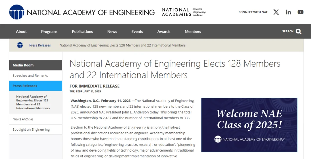 美国华盛顿特区当地时间2025年2月11日,美国工程院(National Academy of Engineering, NAE)公布了2025年新增院士名单,包括128名院士和22名外籍院士。