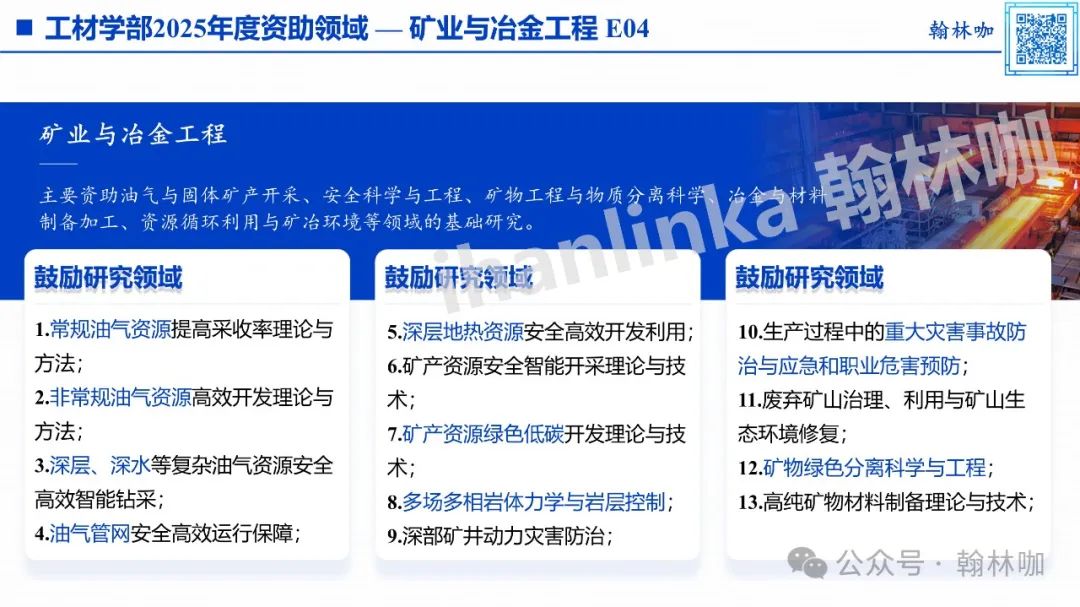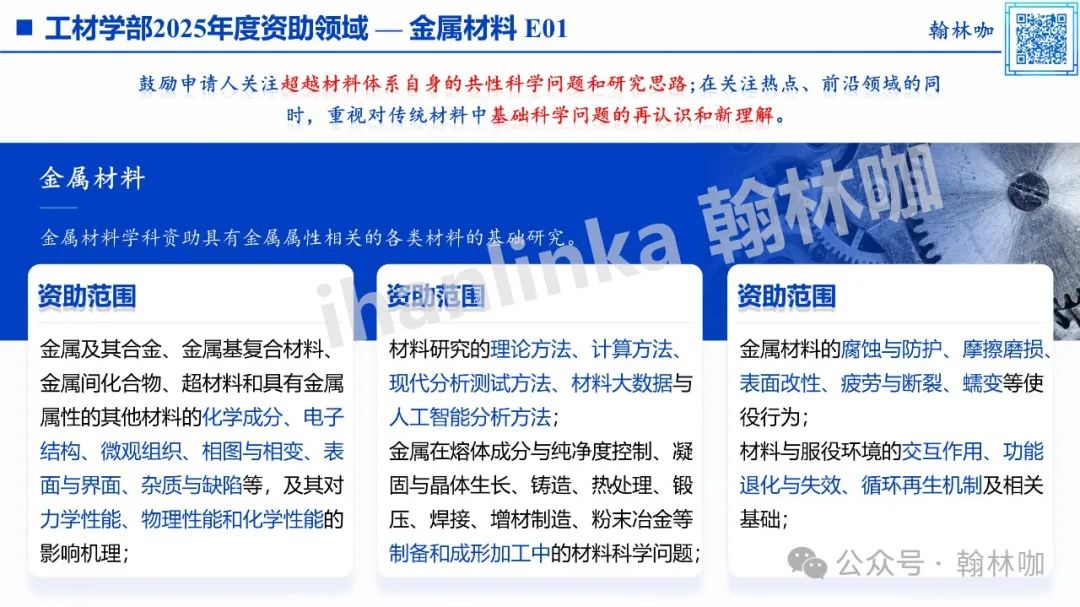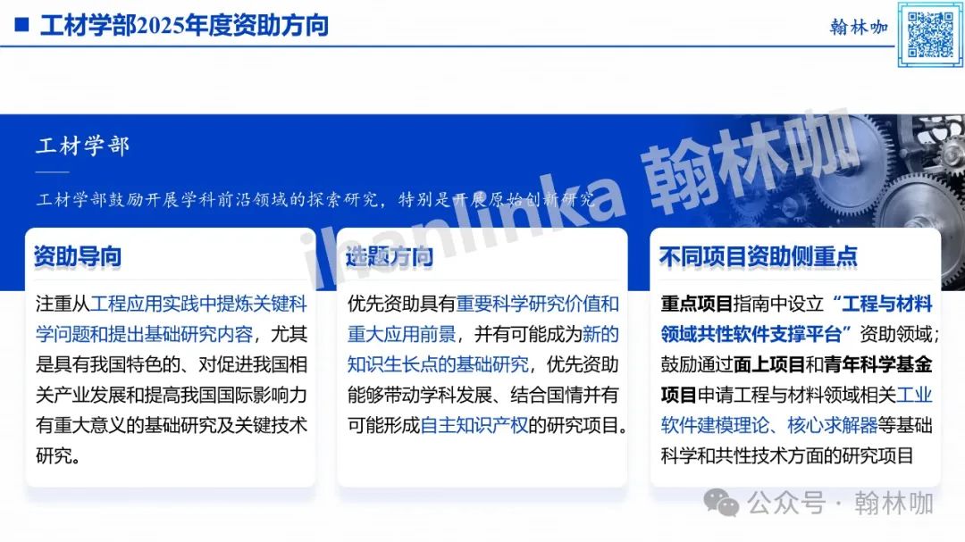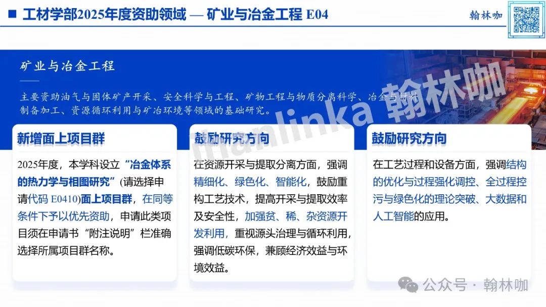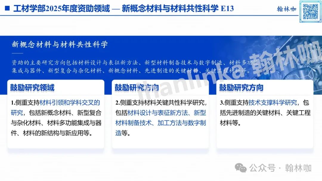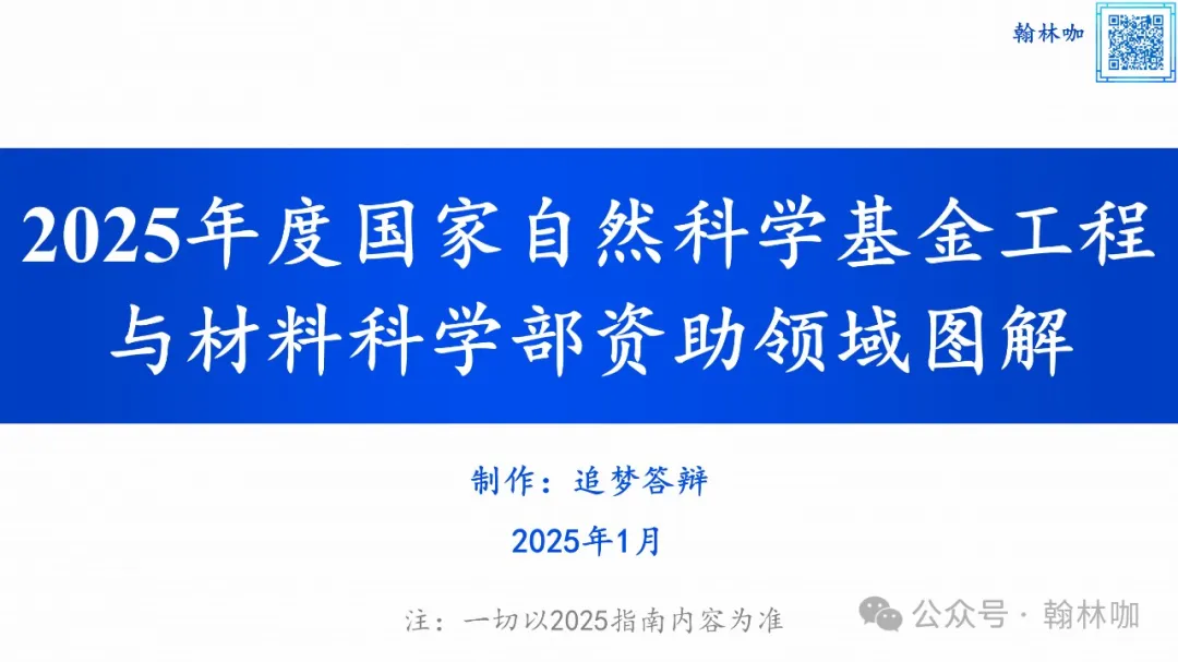 日前,2025年度国家自然科学基金项目指南正式发布。为了帮助广大科研工作者更好地了解各科学部的资助方向与申请要点,提高中标率,翰林咖基于专业视角提炼成直观易懂的PPT,方便申请人快速查阅与参考。下面为工程与材料科学部资助要点: