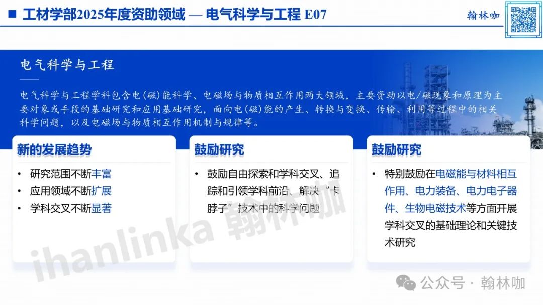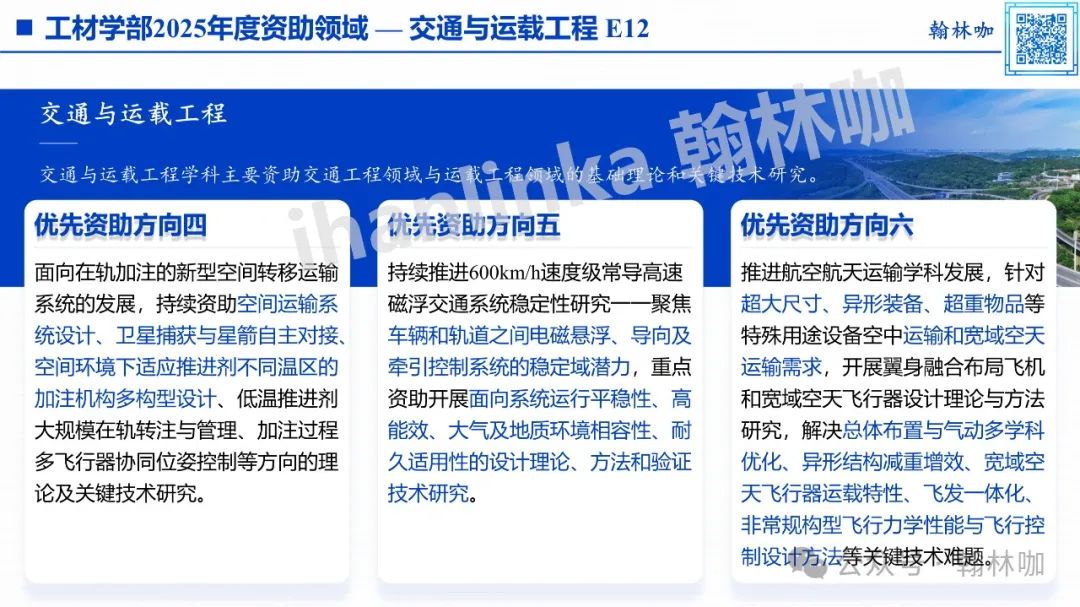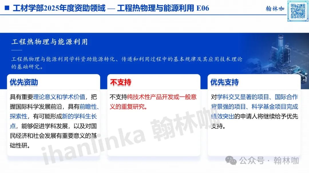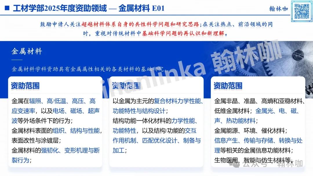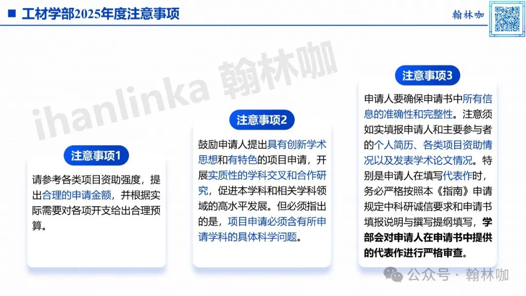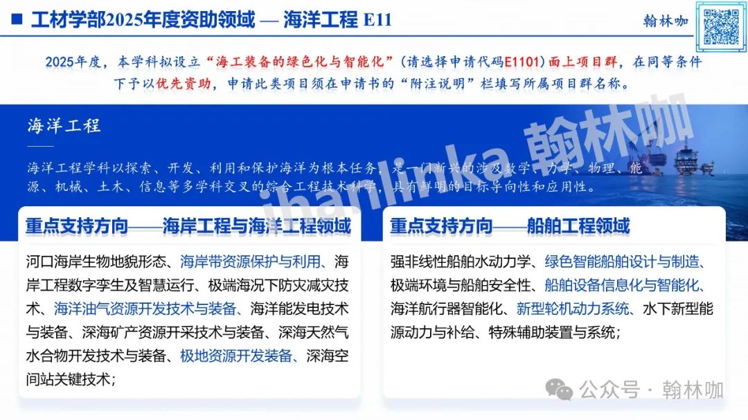 日前,2025年度国家自然科学基金项目指南正式发布。为了帮助广大科研工作者更好地了解各科学部的资助方向与申请要点,提高中标率,翰林咖基于专业视角提炼成直观易懂的PPT,方便申请人快速查阅与参考。下面为工程与材料科学部资助要点: