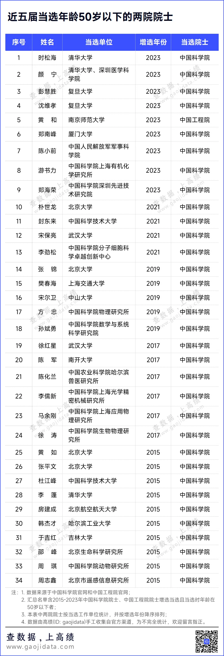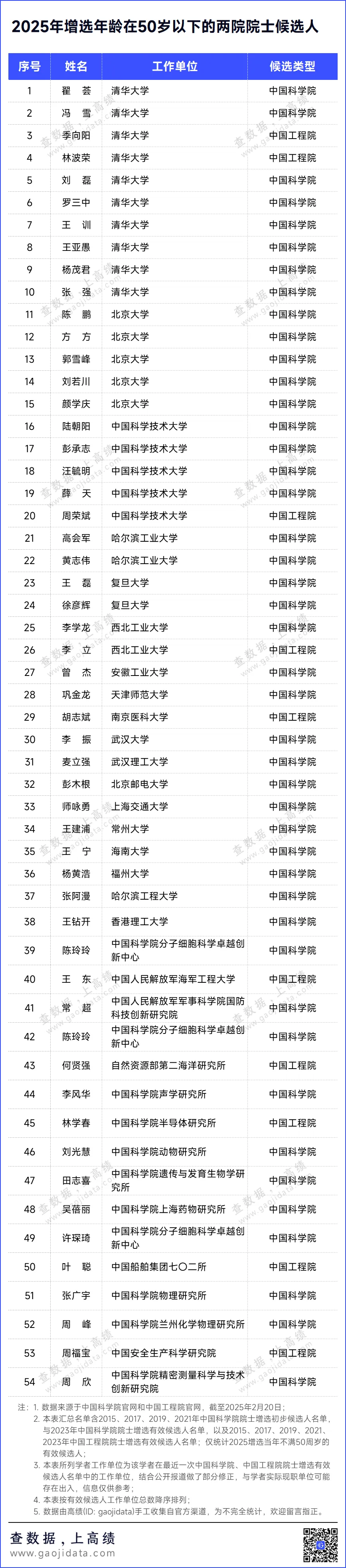 值此背景下高绩汇总了近五届院士增选有效候选人名单,盘点哪些50岁以下(2025年增选当年年龄)的中青年人才有望突出重围当选新一届院士。