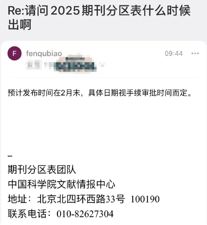 不过,有热心网友出于对学术期刊最新信息的关切,特意给期刊分区表团队发送了邮件,询问2025年中科院分区表的公布时间。很快,该网友便收到了期刊分区表团队的回复。