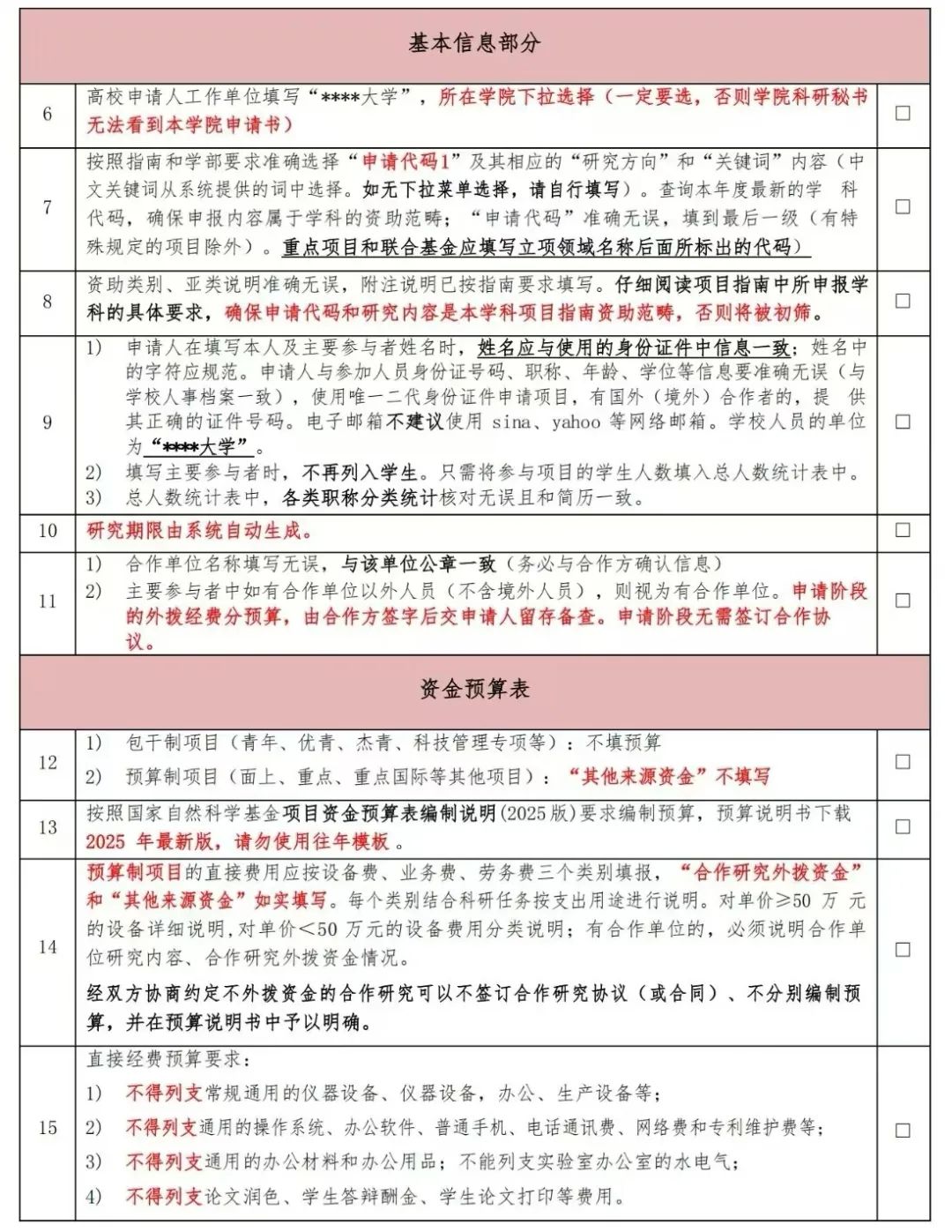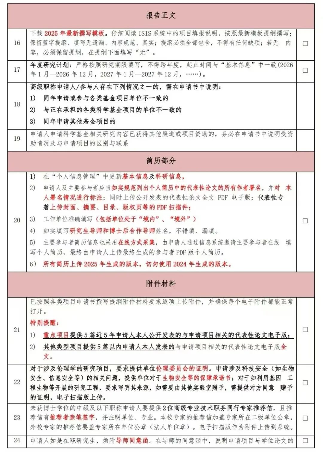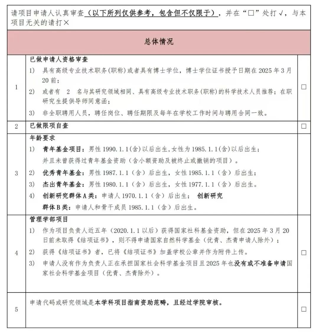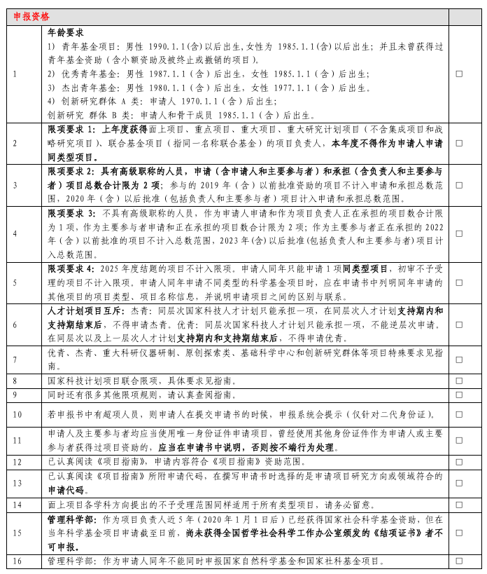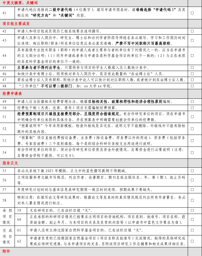 2025年度国家自然科学基金正式提交前要仔细阅读最新申报要求,以下是网上来自不同单位科研管理部门发布的2025年度国家自然科学基金形式审查明细表,分别为76项、28项。仅供参考。