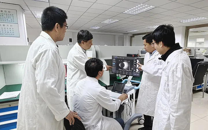 中国医学科学院生物医学工程研究所眼科诊疗技术研发团队负责人杨军(左二)在天津和团队一起交流(2023年11月2日摄)。新华社发