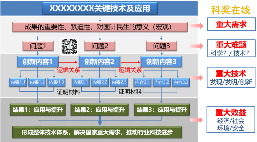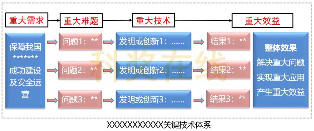 国家科技奖励的技术内容部分是控制字体、字号、行距、五页纸的篇幅。写作尽量保持图文并茂,整体可以采用“总-分-总”的架构(如下图,进步奖为例):
