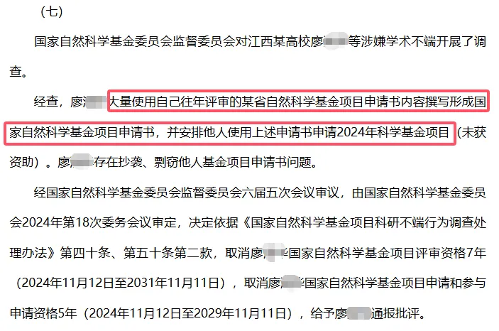 教授大量使用往年评审内容写申请书,国自然通报:取消评审资格7年!