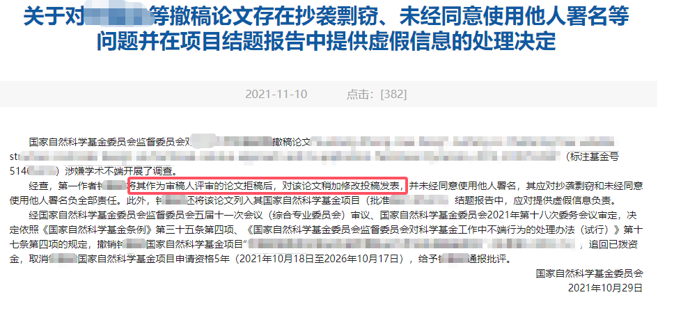 4月11日,国家自然科学基金委员会公布了2025年查处的不端行为案件处理决定(第1批),将其中给予通报批评的15份处理决定予以公布。 其中,使用自己往年评审的某省自然科学基金项目申请书内容撰写形成国家自然科学基金项目申请书,再安排他人使用上述申请书申请科学基金项目的廖某。使得审稿人剽窃这个事,再次进入大家视野。经查,廖某某大量使用自己往年评审的某省自然科学基金项目申请书内容撰写形成国家自然科学基金项目申请书,并安排他人使用上述申请书申请2024年科学基金项目(未获资助)。廖某某存在抄袭、剽窃他人基金项目申请书问题。经国家自然科学基金委员会监督委员会六届五次会议审议,由国家自然科学基金委员会2024年第18次委务会议审定,决定依据《国家自然科学基金项目科研不端行为调查处理办法》第四十条、第五十条第二款,取消廖某某国家自然科学基金项目评审资格7年(2024年11月12日至2031年11月11日),取消廖某某国家自然科学基金项目申请和参与申请资格5年(2024年11月12日至2029年11月11日),给予廖某某通报批评。这种毫无职业道德的操作,遗憾的是,并不是第一次发生。2024年,国自然通报深圳大学李某在他人不知情的情况下,大量使用他人基金项目申请书内容,撰写形成本人的2023年基金项目申请书。决定撤销李某2023年国家自然科学基金项目申请,取消李某国家自然科学基金项目申请和参与申请资格3年,给予通报批评。2021年,国自然通报某985高校博导钟某某将其作为审稿人评审的论文拒稿后,对该论文稍加修改投稿发表,并未经同意使用他人署名,其应对抄袭剽窃和未经同意使用他人署名负全部责任。此外,钟某某还将该论文列入其国家自然科学基金项目结题报告中,应对提供虚假信息负责。在学术评审体系中,审稿人本应是学术质量的“守门人”,但近年来频发的审稿人剽窃论文事件却暴露了这一角色存在信任危机。这类行为往往披着“巧合”或“疏忽”的外衣,实则暗藏系统性漏洞。对于被剽窃的学者来说,更是有苦难言,甚至很多人在没有明确证据的情况下,只能当做是“巧合”,任由自己的学术成果付之一炬。巴基斯坦化学家Muhammad Kashif的论文被拒后,其审稿人Sujit Kumar竟以“文件名混淆”为由,将论文改头换面发表于《皇家化学学会进展》,核心数据、图表结构甚至结论均被复制。更讽刺的是,这类事件并非孤例:伊朗学者Mina Mehregan的论文遭印度审稿人Devarajan剽窃后,维权耗时五个月才得以撤稿。审稿人利用匿名评审特权,剽窃起来只有极低的成本。申请人或是投稿人的权益保护和申诉机制并不完善。作为学者防范基金本子或稿件被剽窃,需构建系统性保护策略。首先,分阶段管理关键节点尤为重要。例如,钟某某事件中,其剽窃的论文原稿因缺乏阶段性存证(如实验数据原始记录、多版本草稿),导致维权初期举证困难。建议将研究进程拆分为选题设计、实验验证、数据分析等阶段,每个节点通过区块链存证平台生成不可篡改的时间戳,或使用带数字水印的PDF版本存档,此类技术已在《信息安全与隐私保护》等期刊中被用于防范数据窃取。另外,将创新点拆解为多个技术模块,分别申请实用新型专利或软件著作权,形成知识产权保护矩阵也很重要。如果是论文,发布预印本可以有效的保护自己的稿件,后续就算需要维权也有确凿的证据。最后,还是呼吁大家都要珍惜自己的学术羽毛,远离学术不端!