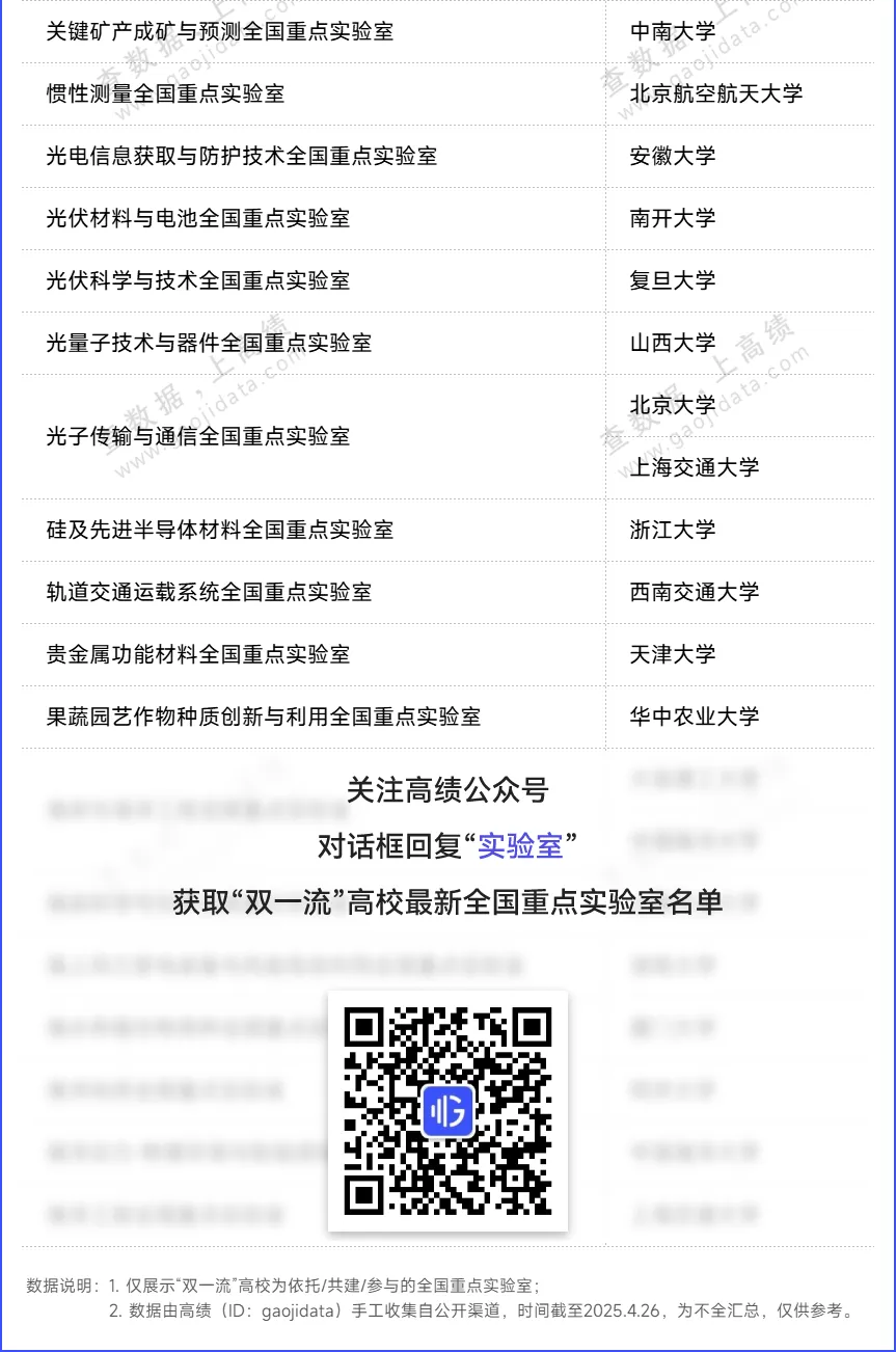 截至2025年4月26日,高绩(ID:gaojidata)据公开渠道不完全汇总整理了超440家全国重点实验室,其中105所“双一流”参与(依托或共建)约八成(超350家)的全国重点实验,其中清华大学、浙江大学、上海交通大学、北京大学等多所985高校获批数量较多。