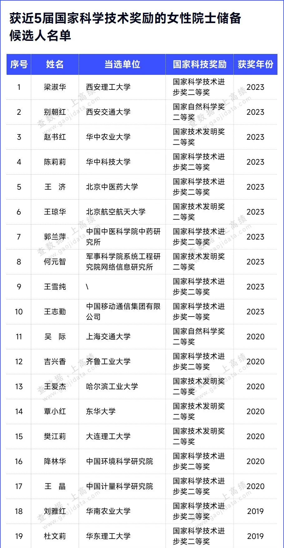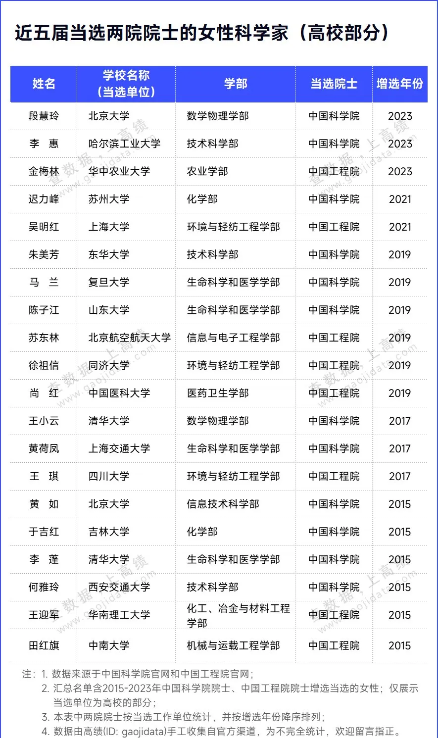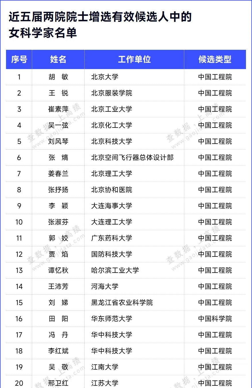 据统计,近五届(2015-2023)增选成功的院士,有多位优秀的女科学家当选,有20位女性来自高校。