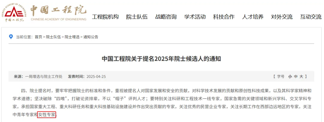 放眼我国学术界,不乏一批优秀的女科学家披荆斩棘,为解决重要科学问题付出不懈努力,发挥着巨大影响力。2025年作为院士增选之年,增选工作将成为各界瞩目的焦点。中国工程院关于提名2025年院士候选人的通知中,也可见“关注女性专家”的字眼。
