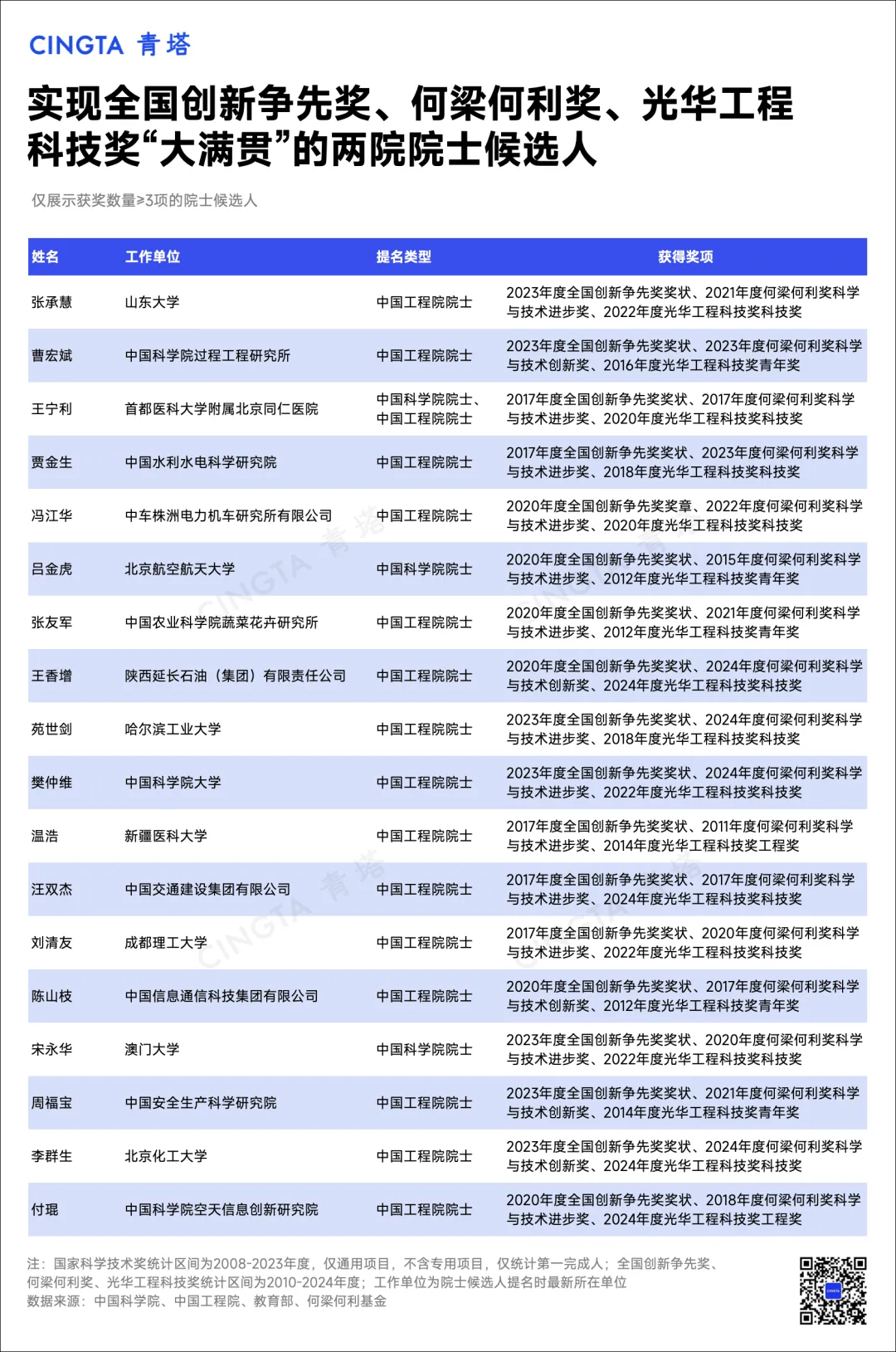 这些含金量极高的社会科学技术奖,也是院士候选人冲击院士称号的重要“敲门砖”。报告汇总了近15年(2010-2024年)的全国创新争先奖、何梁何利奖、光华工程科技奖评选结果,梳理了近5届两院院士候选人的获奖情况。