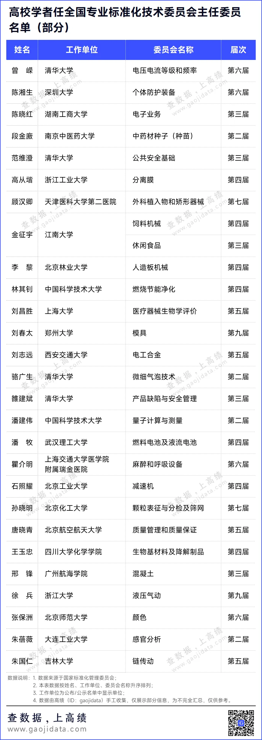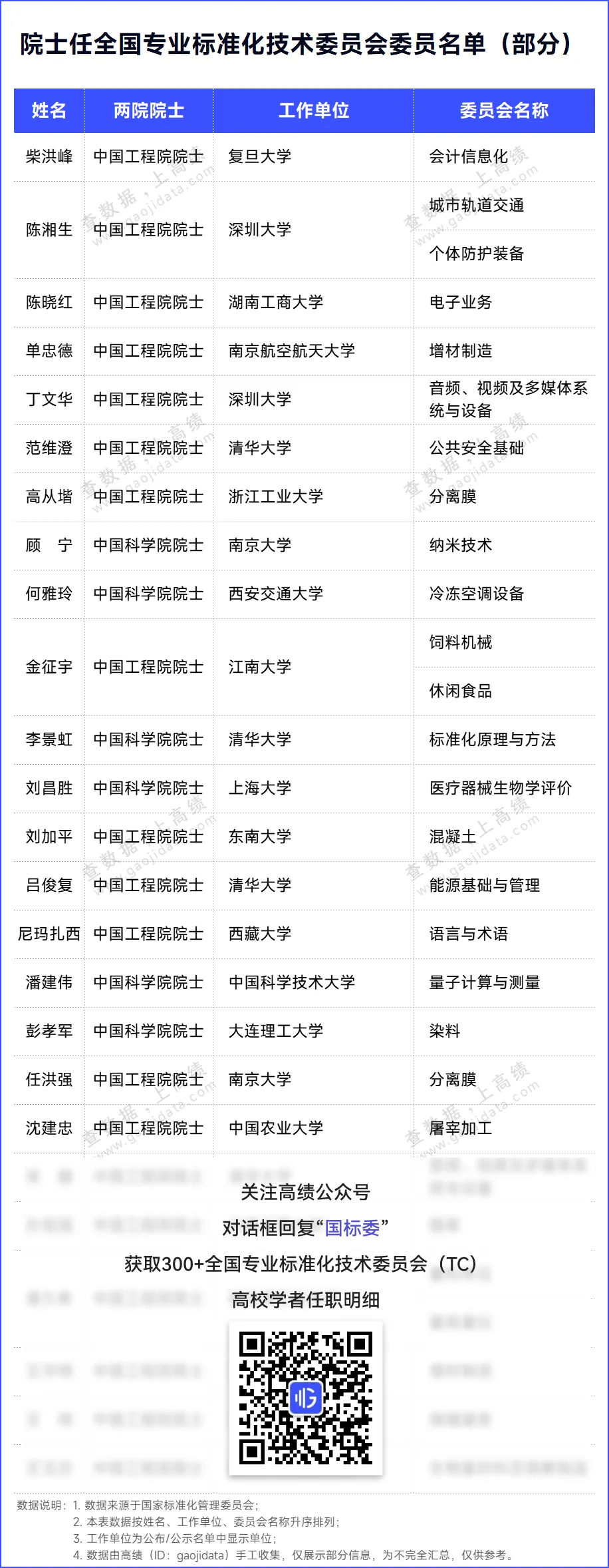 在上述名单中,有近30位高校学者担任全国专业标准化技术委员会主任委员,负责技术委员会全面工作。