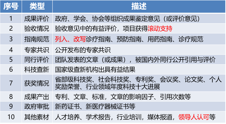 自然奖:体现成果产出与促进学科发展情况:代表作影响力,发表刊物、影响因子、应用、高被引、封面文章等;国内外专家整体认可情况;对产业的影响;促进科学发展情况:大会主题报告、人才培养、平台建设、受邀撰写综述、获奖情况等;