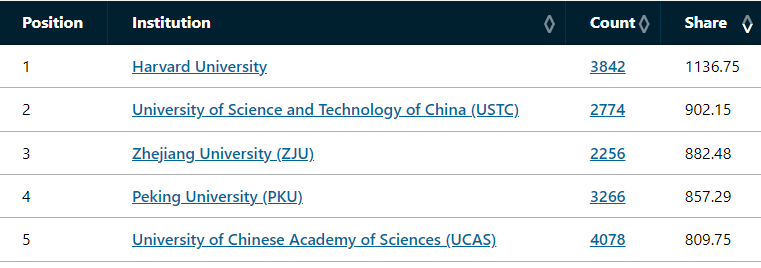 2025年最新高校自然指数排名Top300