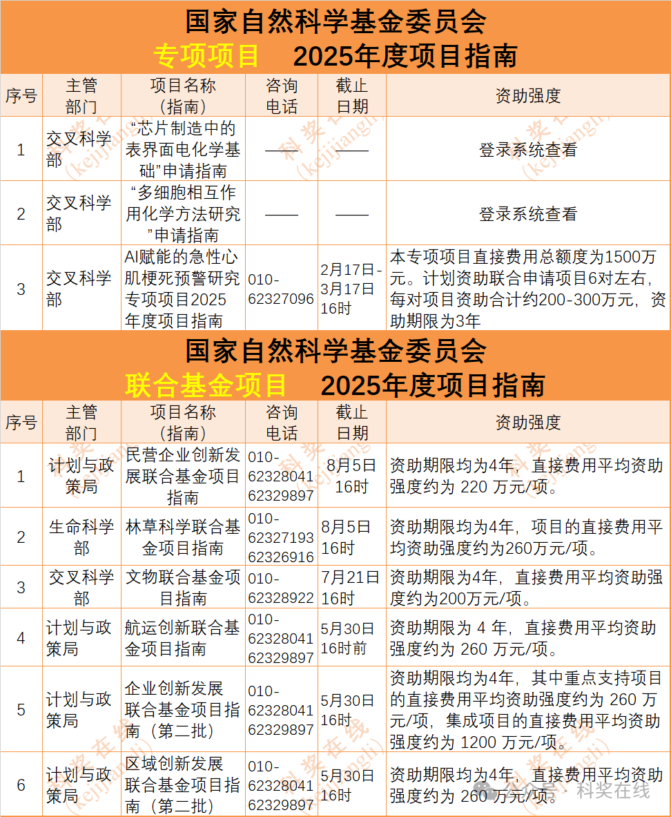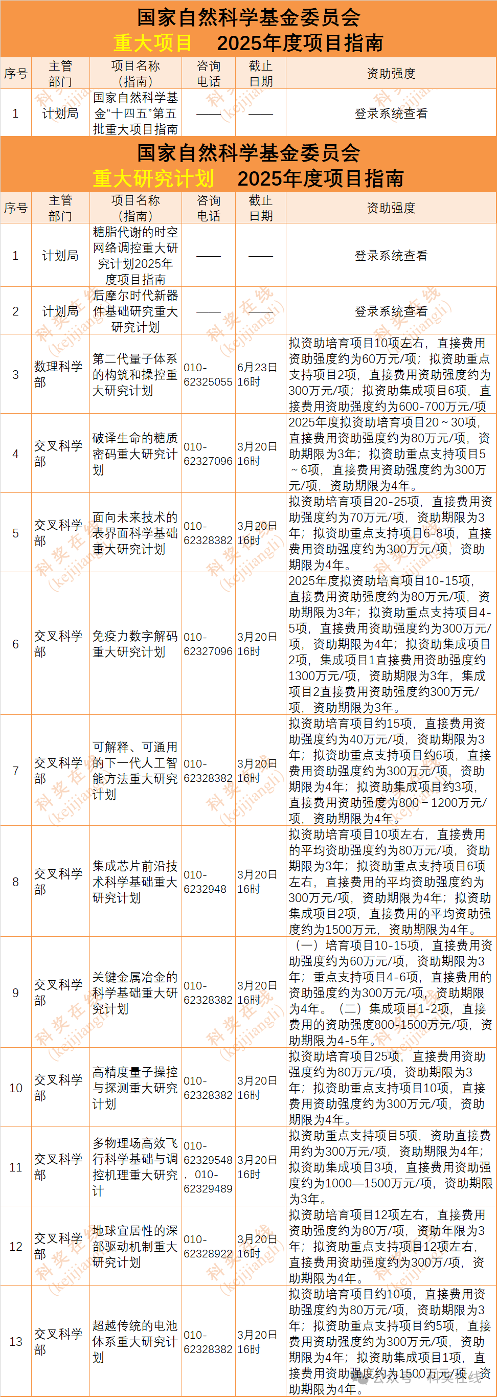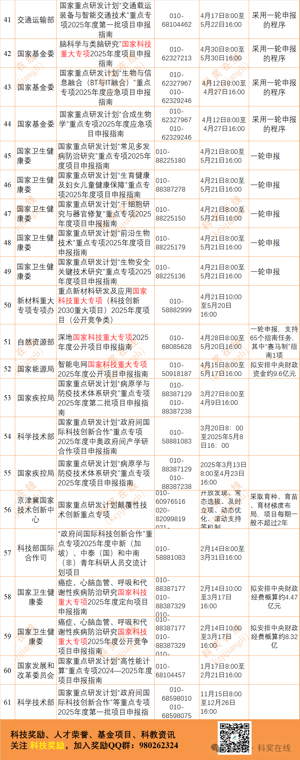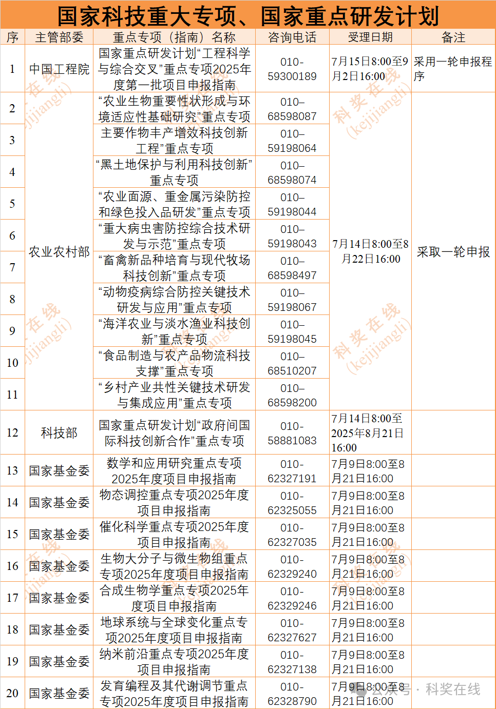 为了让大家更清楚地掌握国家科技项目的布局与申报进展,科奖在线整理了2025年度科技部发布的国家科技重大专项、国家重点研发计划,以及国家自然基金委主管的非集中申报期的重大项目、重大研究计划、专项项目(研究类)、联合基金项目、原创项目、对外合作项目、海外优青项目等的申报安排汇总,具体如下: 一、2025国家科技重大专项、国家重点研发计划申报情况 二、2025国家自然基金委非集中申报项目情况