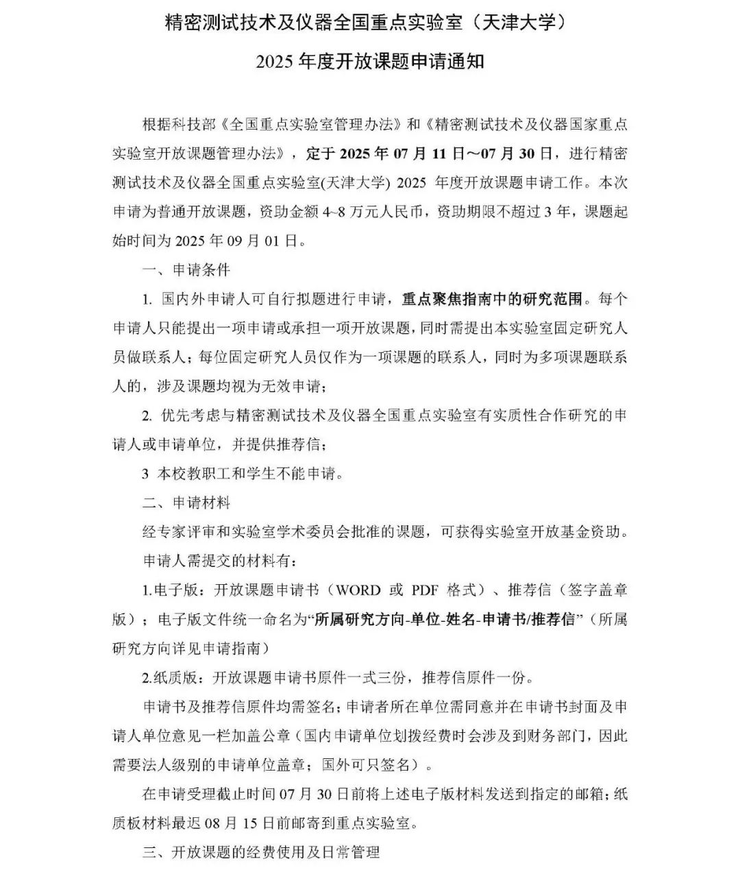 来信投稿:海上风力发电装备与风能高效利用全国重点实验室2025年开放课题申报指南 截止日期:7月20日 一、海上风力发电装备与风能高效利用全国重点实验室简介 海上风力发电装备与风能高效利用全国重点实验室为当前我国风电领域唯一获准建设的全国重点实验室,实验室依托湖南兴蓝风电有限公司、湘潭电机股份有限公司和湖南大学,在能源技术革命和实现“双碳”目标的重要历史机遇期,围绕风力发电“海洋化、规模化、数智化”带来的技术变革,致力于打破国外对我国风电装备领域理论、设计、制造、试验、运行等“卡脖子”禁锢,破解高端风电技术装备对外依存度高的瓶颈,打造我国高端海上大功率风电装备与风能高效利用技术策源地和高水平人才聚集地。 为充分发挥全国重点实验室科研平台的作用,促进科研合作和学术交流,实验室按照“开放、联合、流动、竞争”的运行机制,根据《海上风力发电装备与风能高效利用全国重点实验室开放课题管理办法》设立开放课题,以促进相关学科的相互交叉和集成。热忱欢迎和邀请相关领域的国内外科研人员与实验室人员进行合作研究,共同推动我国海上风力发电装备与风能高效利用领域的科学与技术的发展。现发布2025年开放研究课题申请指南如下: 二、申请人资格 开放课题面向国内外相关研究领域的高等院校、科研机构和企业等非本全重实验室依托单位研究人员。申请人原则上应具有博士学位或高级及以上技术职称,特殊情况须由实验室主任审定。 三、开放课题重点资助研究方向 1.大功率海上风电机组基础理论与关键技术研究 (1)大功率海上风电机组全过程能量传递协同作用理论; (2)大型海上风电机组系统集成及高可靠设计制造技术; (3)大型海上风电机组关键材料及核心部件技术; (4)大型风电机组关键参数的新型测量技术; (5)大型风电机组仿真设计与试验验证技术。 2.智能化风电场集群关键技术研究 (1)大规模风电场集群多域协同的梯次演进理论与设计方法; (2)风电机群虚拟现实与数字孪生技术; (3)风电机群全寿命周期健康预测与智能管理技术; (4)风电机群服役效能评估与调控关键技术。 3.风能高效利用关键技术研究 (1)新型风能高效能量转换理论与装备; (2)基于海上风力发电的多能源高效融合技术; (3)面向新型电力系统的风电机组友好并/组网关键技术; (4)复杂/灾害环境下风电机组适应性技术。 四、申请要求和程序 1.项目执行期和资助金额 2025年设立开放课题15项,执行期原则上不超过2年,资助金额不高于20万元/项。 2.申请程序 (1)开放课题实行申请人和本室合作人共同负责制。为了保障开放课题顺利执行,每项开放课题至少有一名实验室固定研究人员作为课题合作人; (2)申请人根据申请指南中的研究内容,自行选择课题,在申请截止时间(2025年7月20日)之前填写并提交《2025年度海上风力发电装备与风能高效利用全国重点实验室开放课题申请书》(附件1)及电子版; (3)申请书先由全重实验室综合管理部进行初审,符合申请要求的课题由全重实验室组织专家进行会议评审。根据评审结果,经由全重实验室主任批准课题资助决定,全重实验室综合管理部及时向申请人及其所在单位发布立项通知。 四、项目管理和验收要求 (1)课题负责人及主要研究人员应按照开放课题任务书组织开展研究,每半年向全重实验室提交项目工作简报,并及时提交相关成果。如发现原研究计划执行不力或不能实现时,全重实验室有权调整、暂停或撤销资助; (2)开放课题所产生的研究成果由全重实验室与课题负责人所在单位共享; (3)与开放课题相关的论文、专著、专利、软件、图纸等成果,均应注明“海上风力发电装备与风能高效利用全国重点实验室开放课题项目”和课题编号,未按要求标注的成果,检查、验收均时不予承认。课题组成员发表论文、专利与软件著作权等应按照开放课题协议要求对作者单位进行标注; (4)在项目结题后,可择优遴选一部分绩效评价为“优秀”的项目,给予滚动支持。 五、联系方式 附件下载及实验室网址链接:https://yldlcdyxxfdjs.hnu.edu.cn/lxwm/kfkt.htm 联系人:吕铭晟、肖华林、张大功 邮编:411102 电话:0731-88822461 电子邮箱:HFSKL@qq.com;xiaohualin@hewp.com.cn;zdg@xemc.com.cn; 半导体显示材料与芯片重点实验室开放课题申请指南(2025) 截止日期:无 依托中国科学院苏州纳米技术与纳米仿生研究所组建的半导体显示材料与芯片重点实验室2024年获批成立,聚焦半导体显示材料缺陷密度高、芯片能效低等基础科学问题,开展关键材料、核心器件与集成芯片的创新研究,突破高质量材料生长与高性能芯片制备的关键技术,集聚一批由战略科学家、青年学术带头人等组成的科技创新队伍,目标产出一批原创性科技成果,推动科技成果的转移转化,着力建设成半导体显示材料与芯片领域创新高地。 重点实验室秉持“开放、联合、流动、竞争”的运行机制,鼓励相关学科的相互结合与促进,设立开放课题,热忱欢迎和邀请半导体显示材料与芯片领域的国内外优秀科研人员、科研团队与实验室开展合作研究。 一、资助领域 1、高质量半导体光电材料 GaN基和GaAs基III-V族化合物半导体材料外延生长与测试表征 2、高能效红绿蓝微纳光电器件 GaN基和GaAs基化合物半导体微纳光电器件(红绿蓝高效Micro-LED、半导体边发射与面发